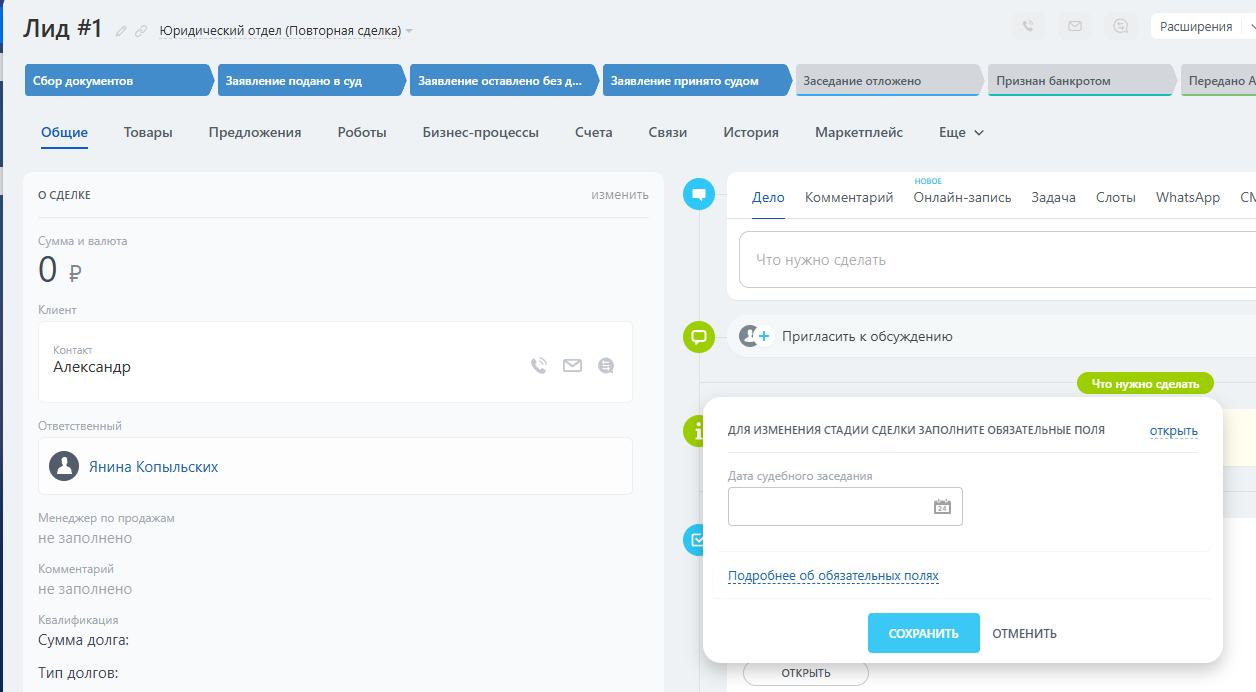 Автоматизация работы юридической компании, специализирующейся на банкротстве физических и юридических лиц — от первичного обращения клиента до судебного процесса и списания долгов. Система управляет лидами, сделками отдела продаж и юридического отдела, контролирует этапы работы, документооборот и финансовые расчеты.
