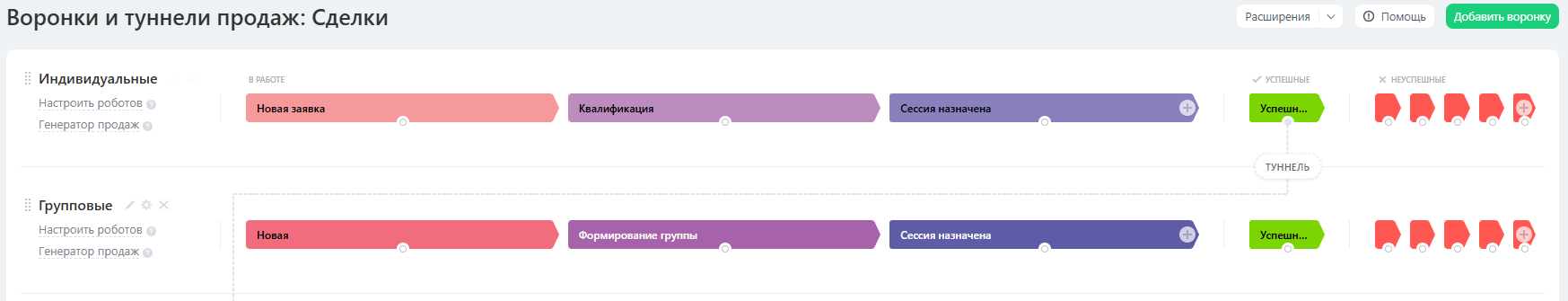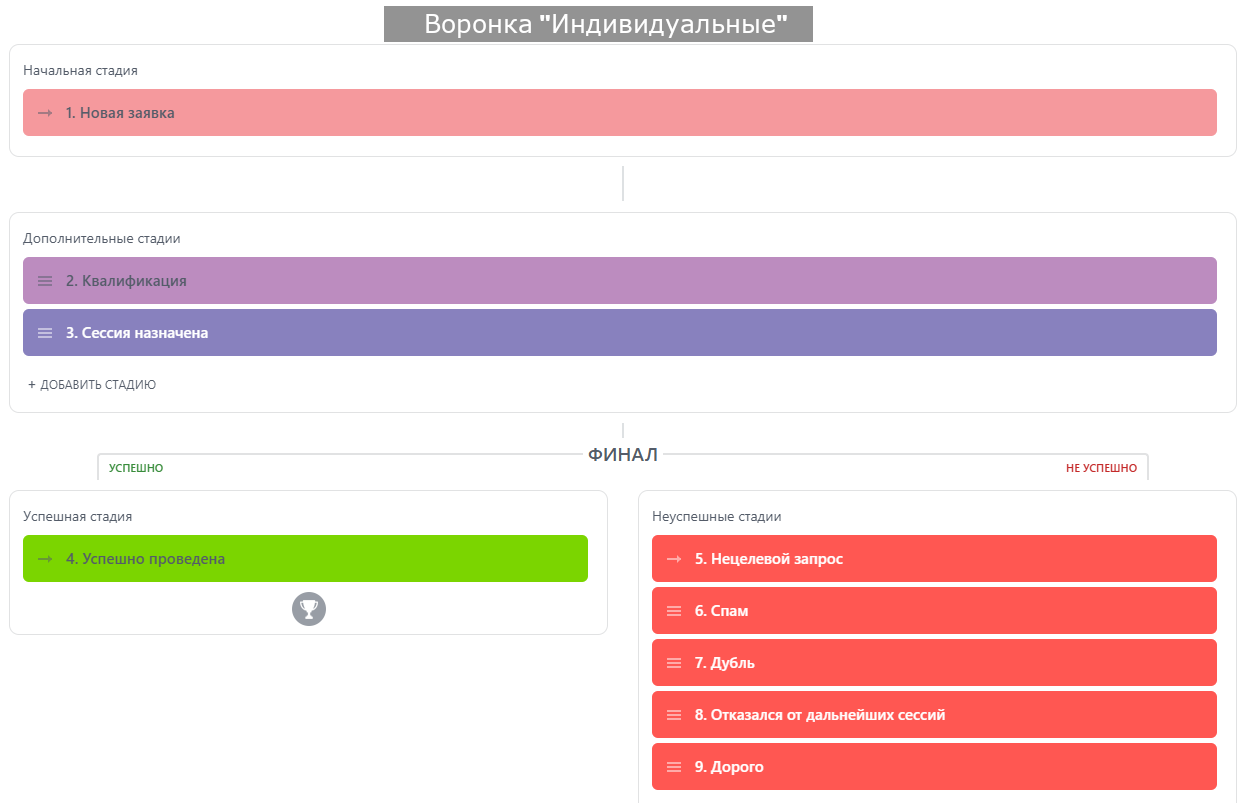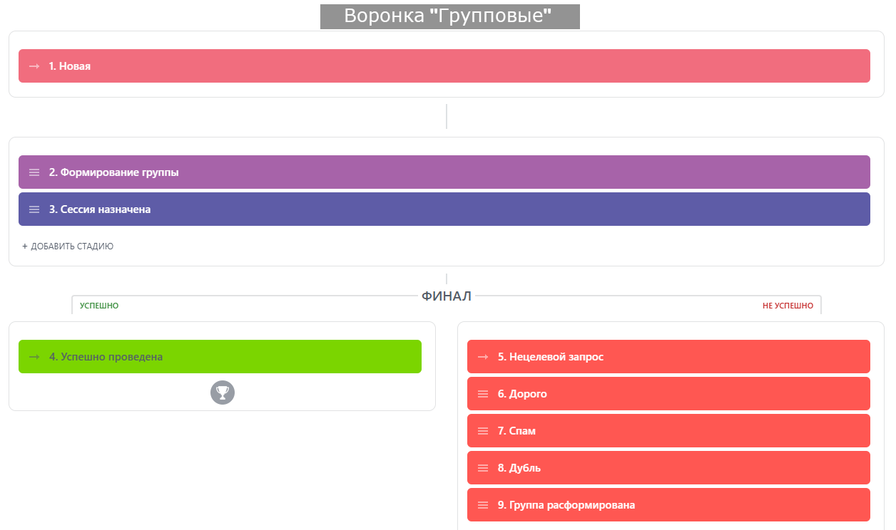 Стадии: Новая → Формирование группы (для групп) / Квалификация (для индивидуальных)