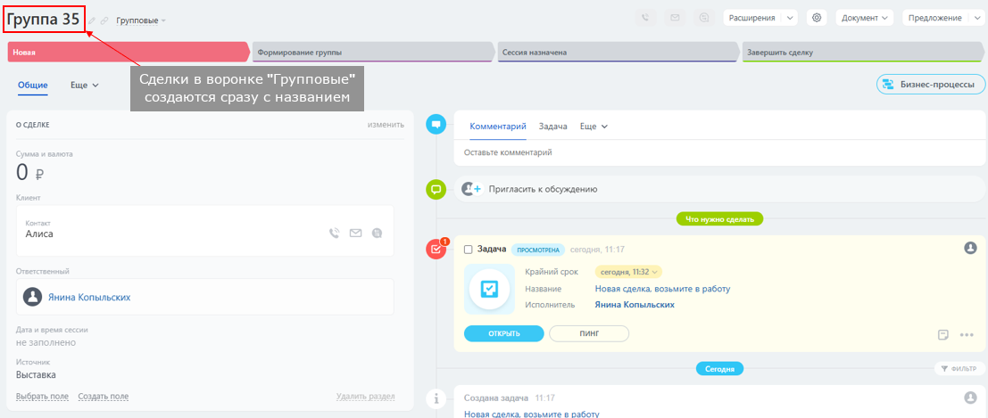 В групповой воронке → копируется на стадию "Новая"