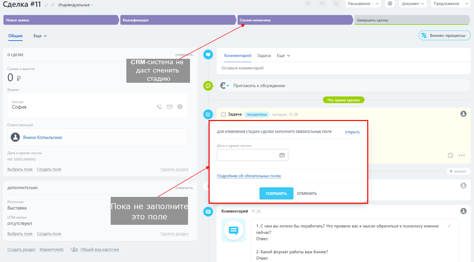 Обязательное поле: "Дата и время сессии" (блокирует смену стадии если не заполнено)