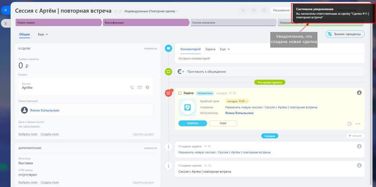 ✨ Пользовательское поле "Дата и время сессии" (обязательно для заполнения на стадии "Сессия назначена")