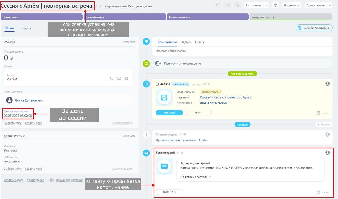 | Отправить напоминание | За 24 часа до сессии | Автоматически |