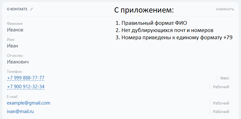 | Стандартизация номеров | Корректные звонки и рассылки, экономия времени |