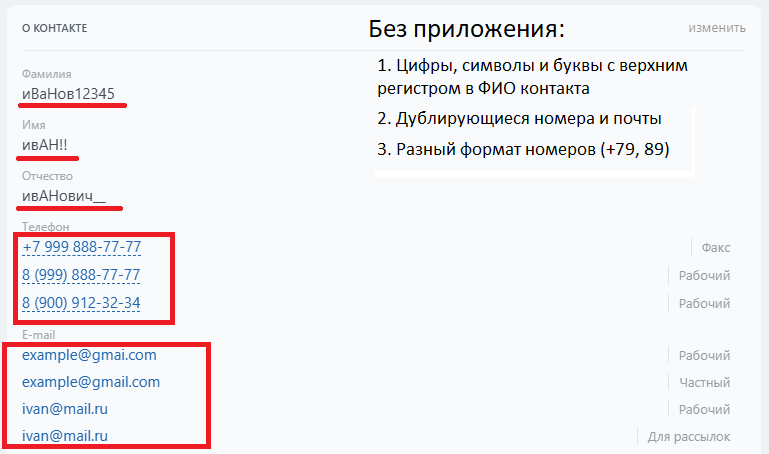 Автоматическая чистка контактов: без лишних символов, дубликатов и с правильными номерами.