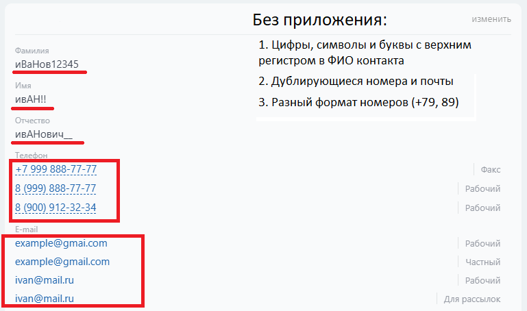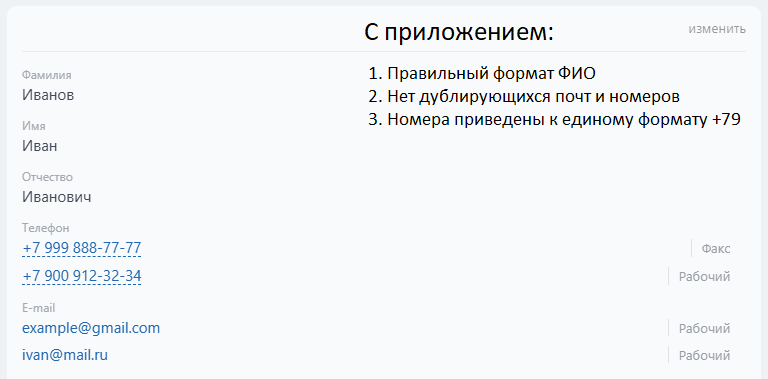 | Стандартизация номеров | Корректные звонки и рассылки, экономия времени |