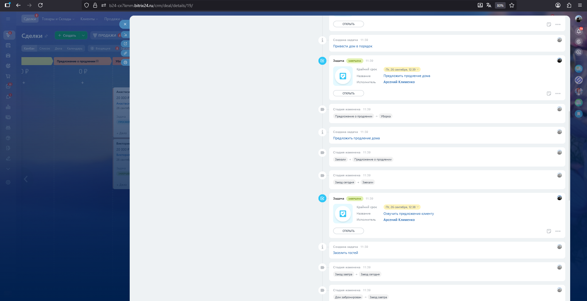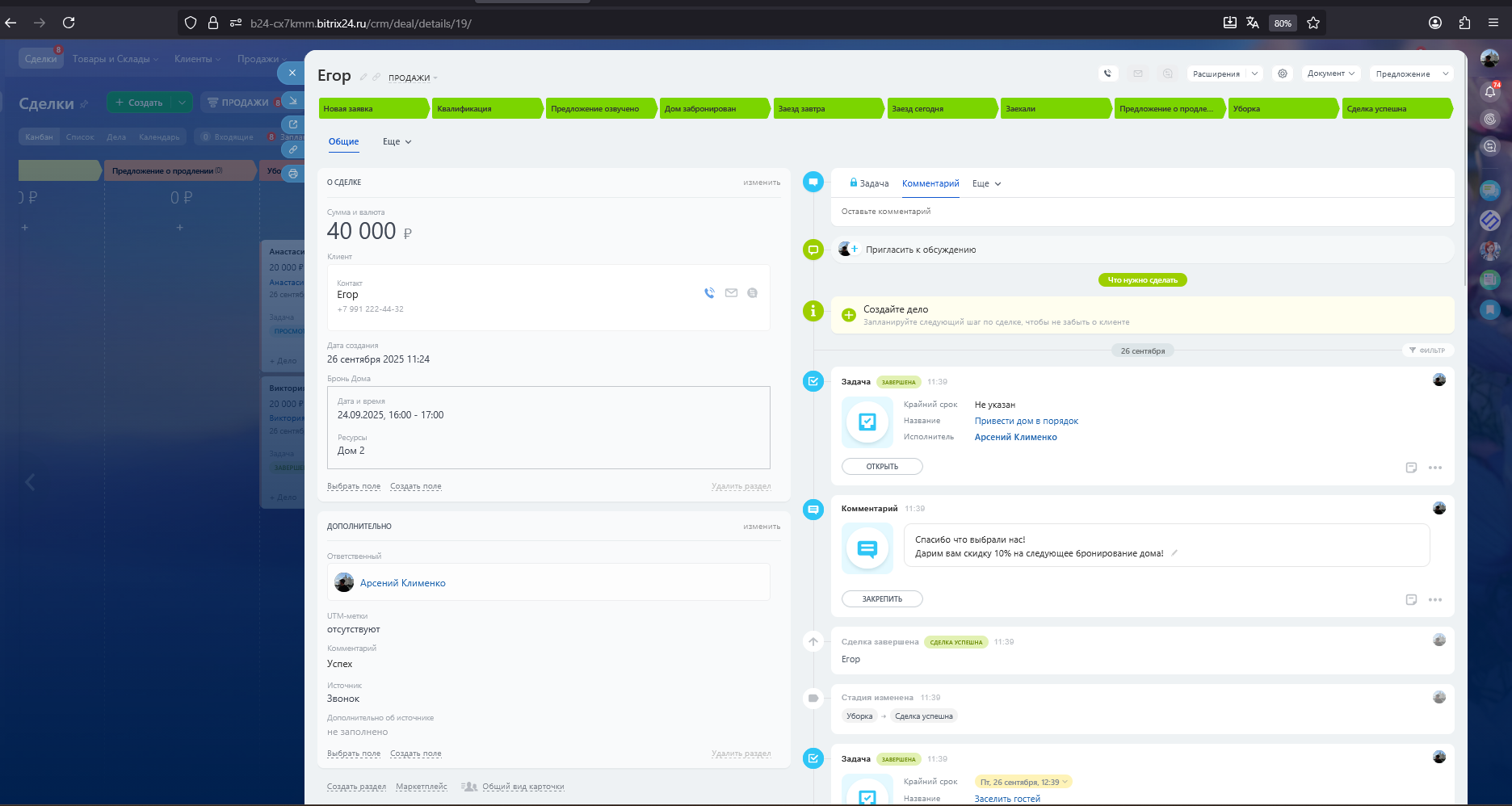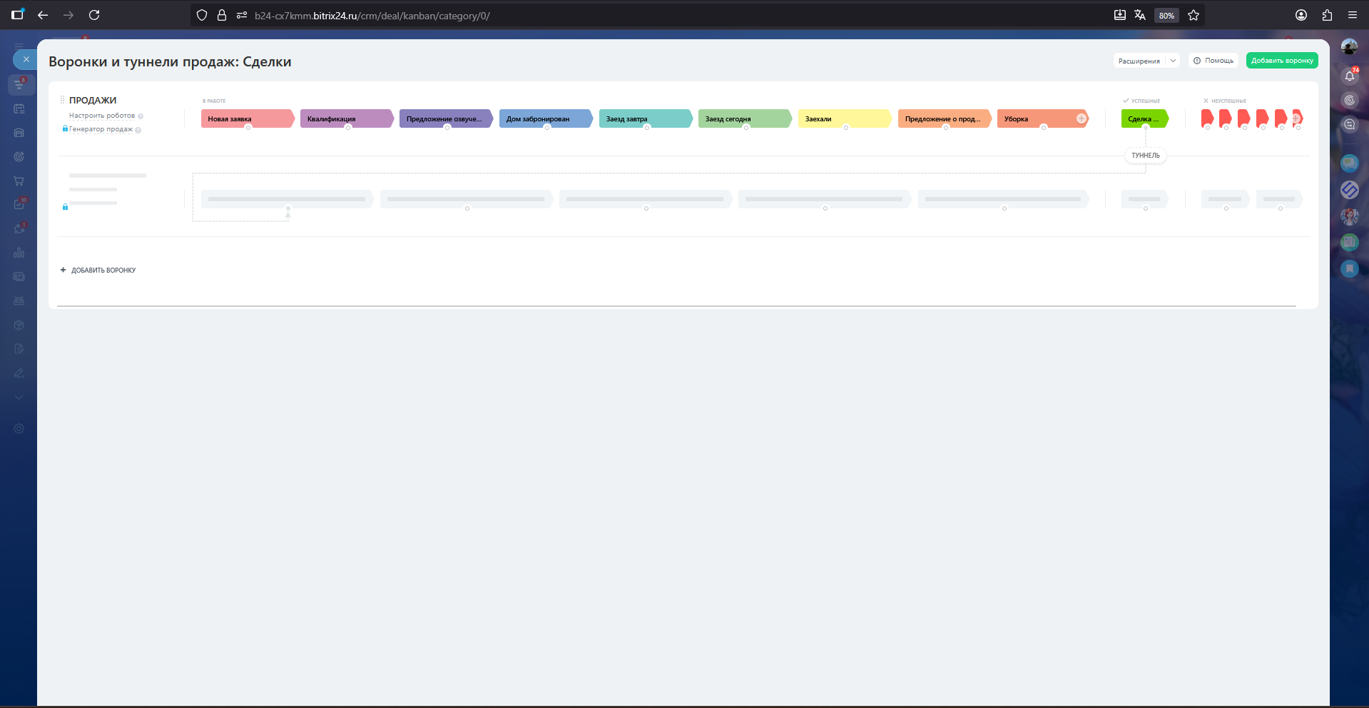 Новая заявка → Квалификация → Предложение озвучено → Дом забронирован → Заезд завтра → Заезд сегодня → Заехали → Предложение о продлении →Уборка → Сделка успешна\Перестал выходить на связь\Нецелевой запрос\СПАМ\Дубль\Отложил\Выбрал других