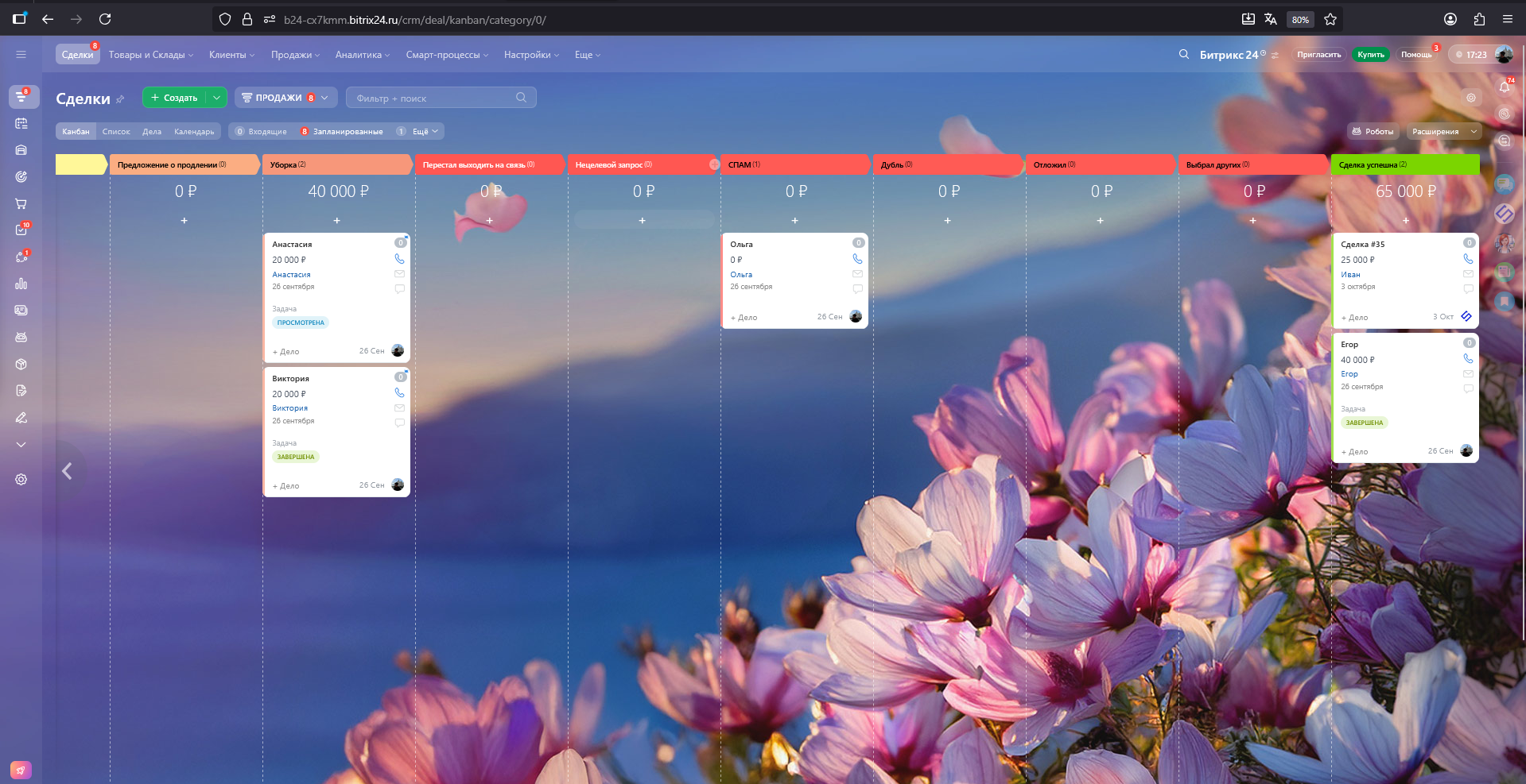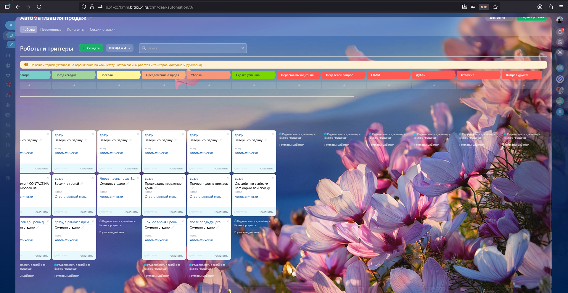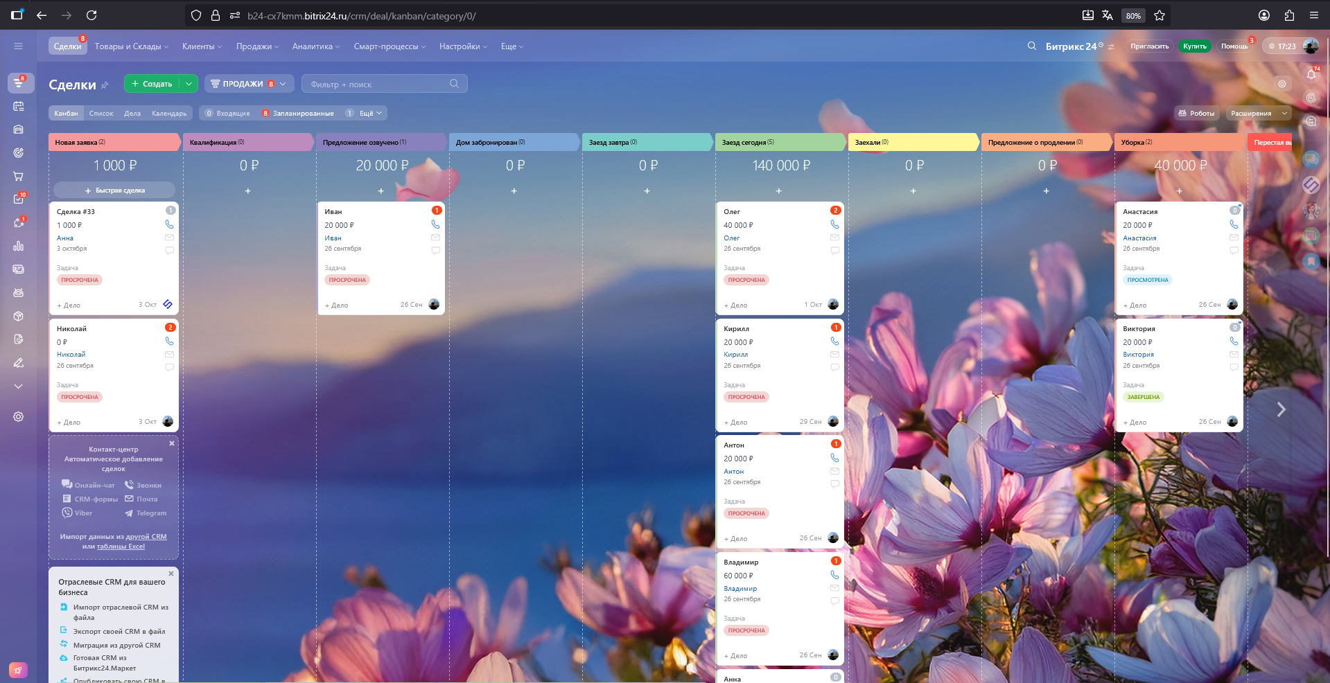 Новая заявка → Квалификация → Предложение озвучено → Дом забронирован → Заезд завтра → Заезд сегодня → Заехали → Предложение о продлении →Уборка → Сделка успешна\Перестал выходить на связь\Нецелевой запрос\СПАМ\Дубль\Отложил\Выбрал других