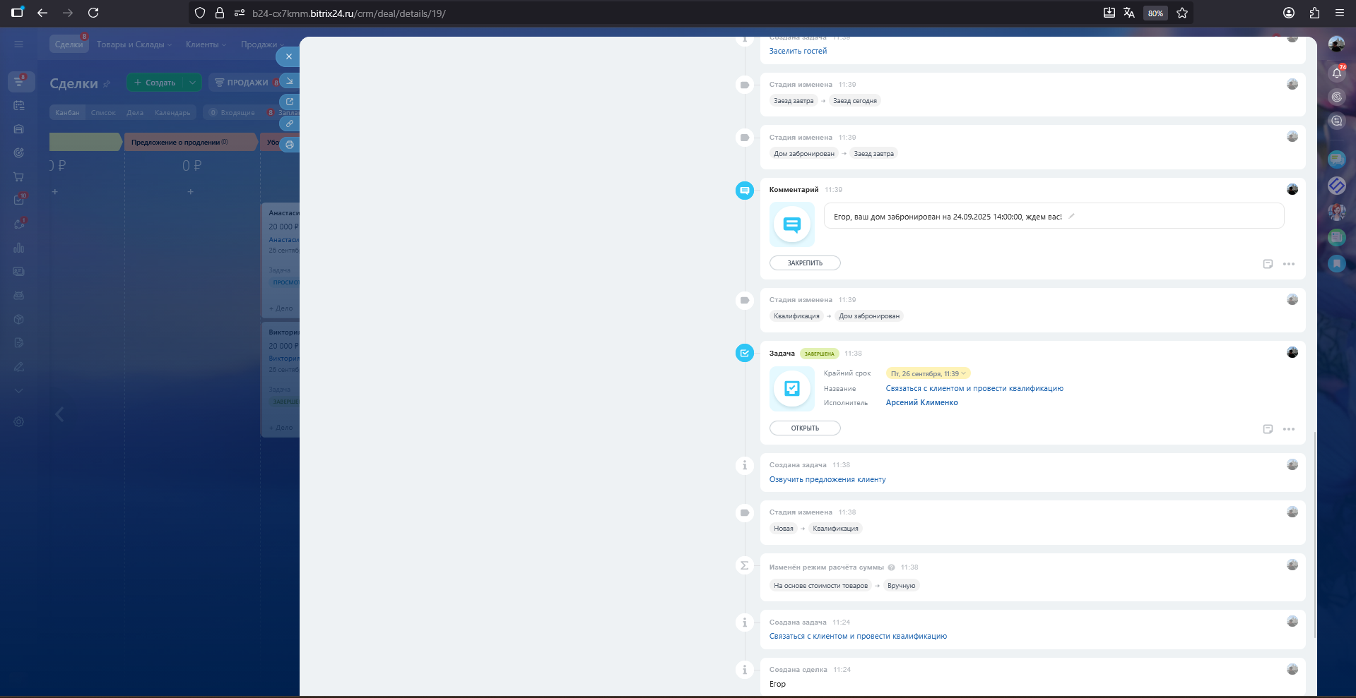 Автоматизация работы бизнеса в сфере глэмпинг — от первичной заявки клиента до заселения клиентов, выселения и уборки. Система управляет стадиями сделки, контролирует задачи менеджеров и обеспечивает коммуникацию с клиентами.