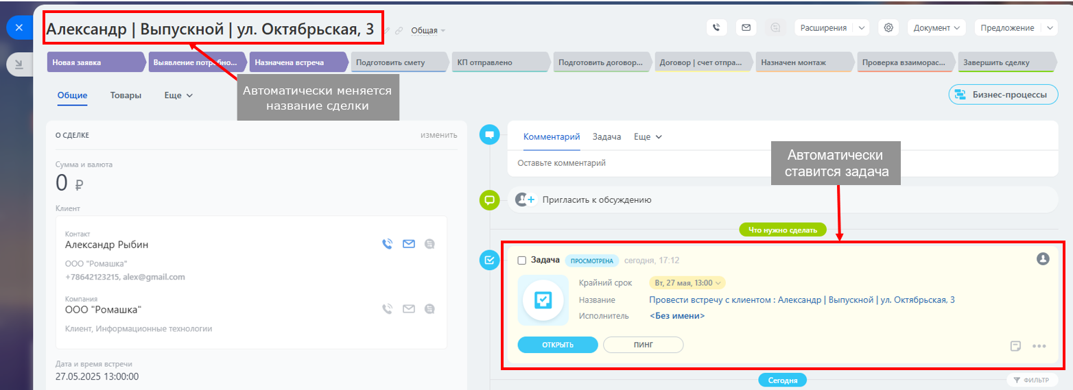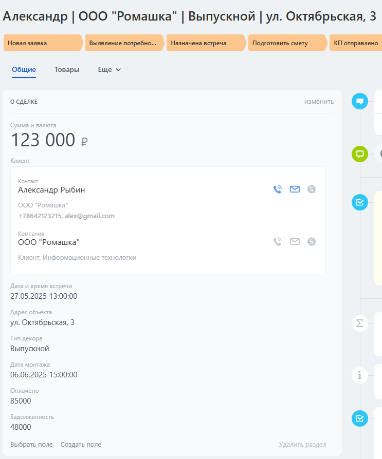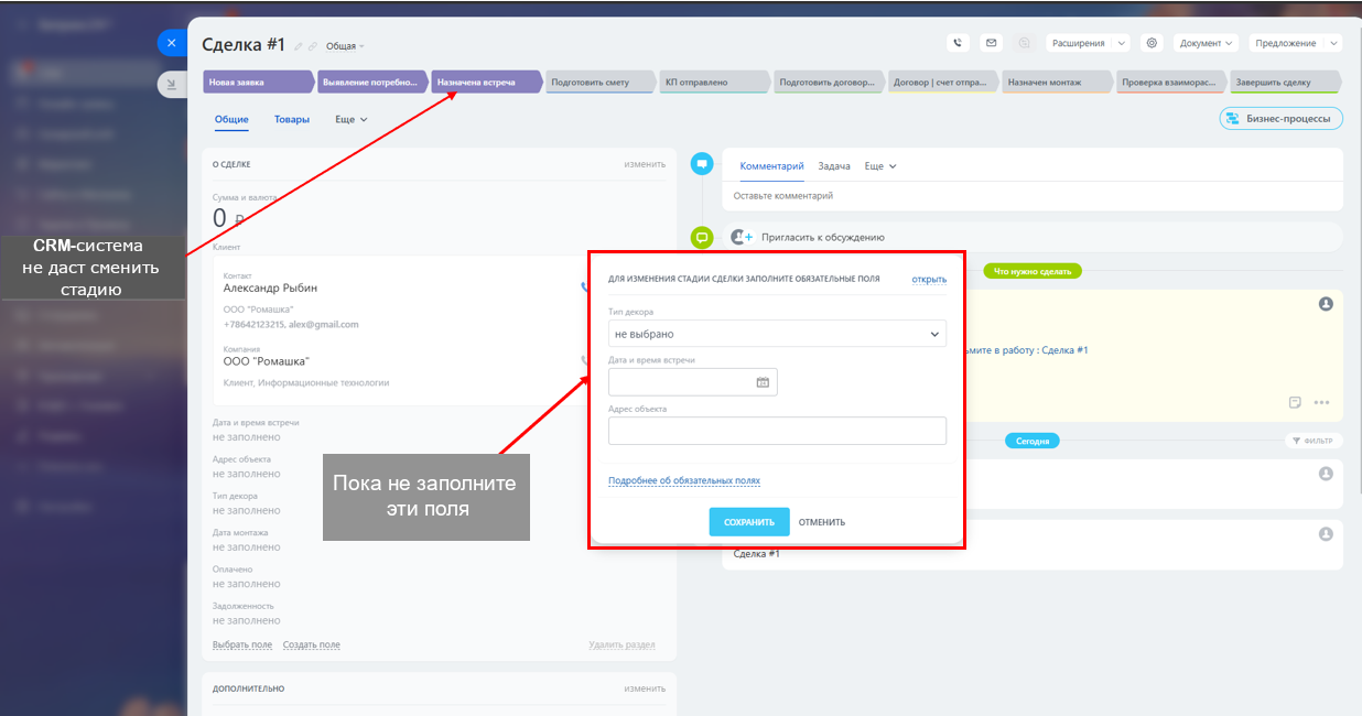 На этапе "Выявление потребности" менеджер определяет запросы клиента относительно декоративного оформления: стилевые предпочтения, бюджет и сроки. Автоматизированный робот помогает собрать информацию и назначить встречу. Для фиксации деталей используются поля, обязательные при переходе на следующую стадию: Дата и время встречи, Адрес объекта, Тип декора.