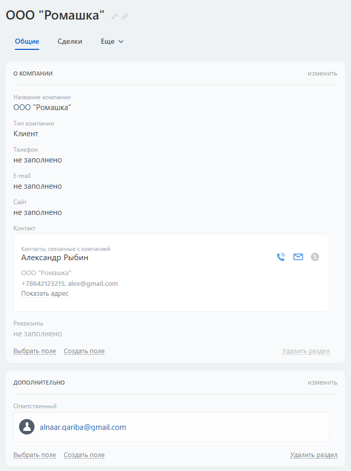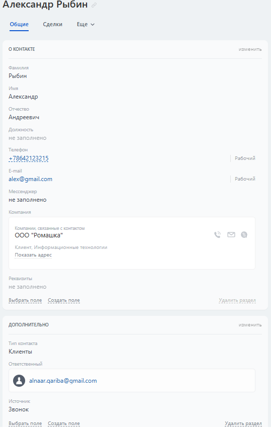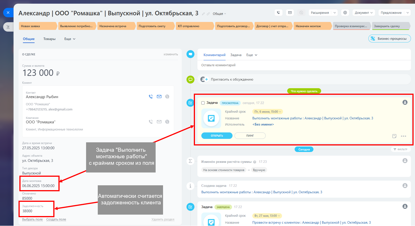 Стадии "Подготовить договор | счет" и "Договор | счет отправлен" связаны с формализацией соглашения. Роботы напоминают о необходимости подготовки документов и автоматически обновляют статус сделки после их отправки. Для фиксации деталей используются поля, обязательные при переходе на следующую стадию: Оплачено, Дата монтажа. Далее, поле Задолженность высчитывается автоматически.