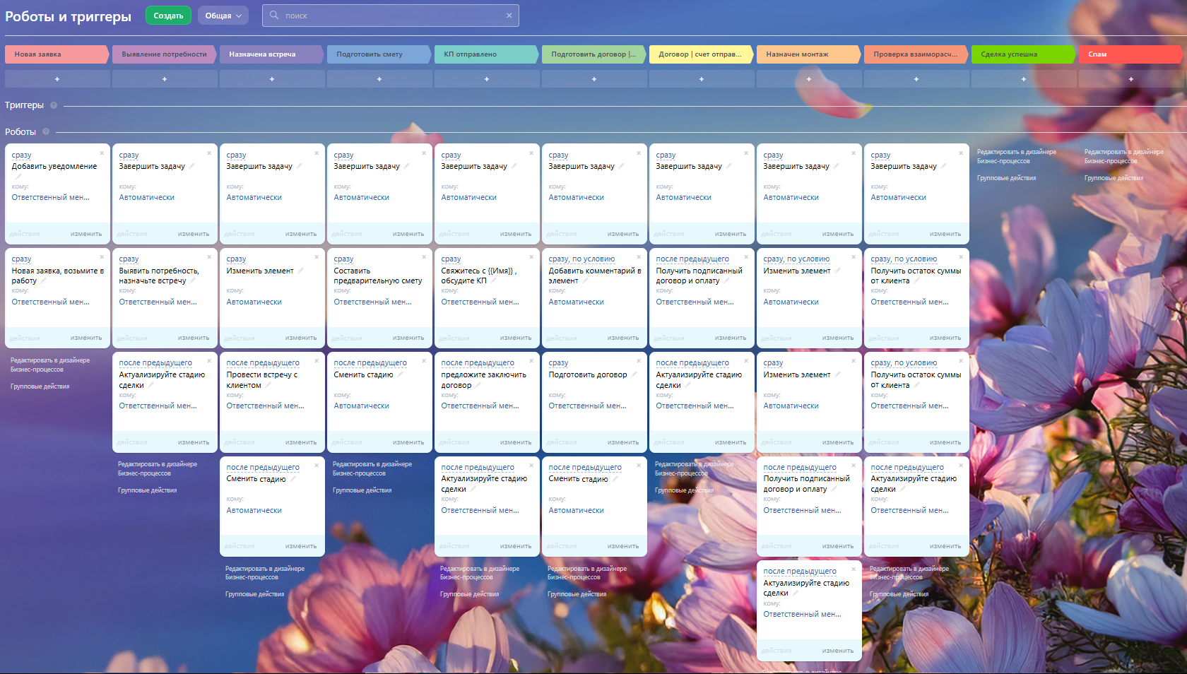 Этапы "Назначен монтаж" и "Проверка взаиморасчетов" охватывают планирование и выполнение работ по декорированию. Автоматизированные задачи для исполнителей и контроль платежей обеспечивают эффективную реализацию проекта.