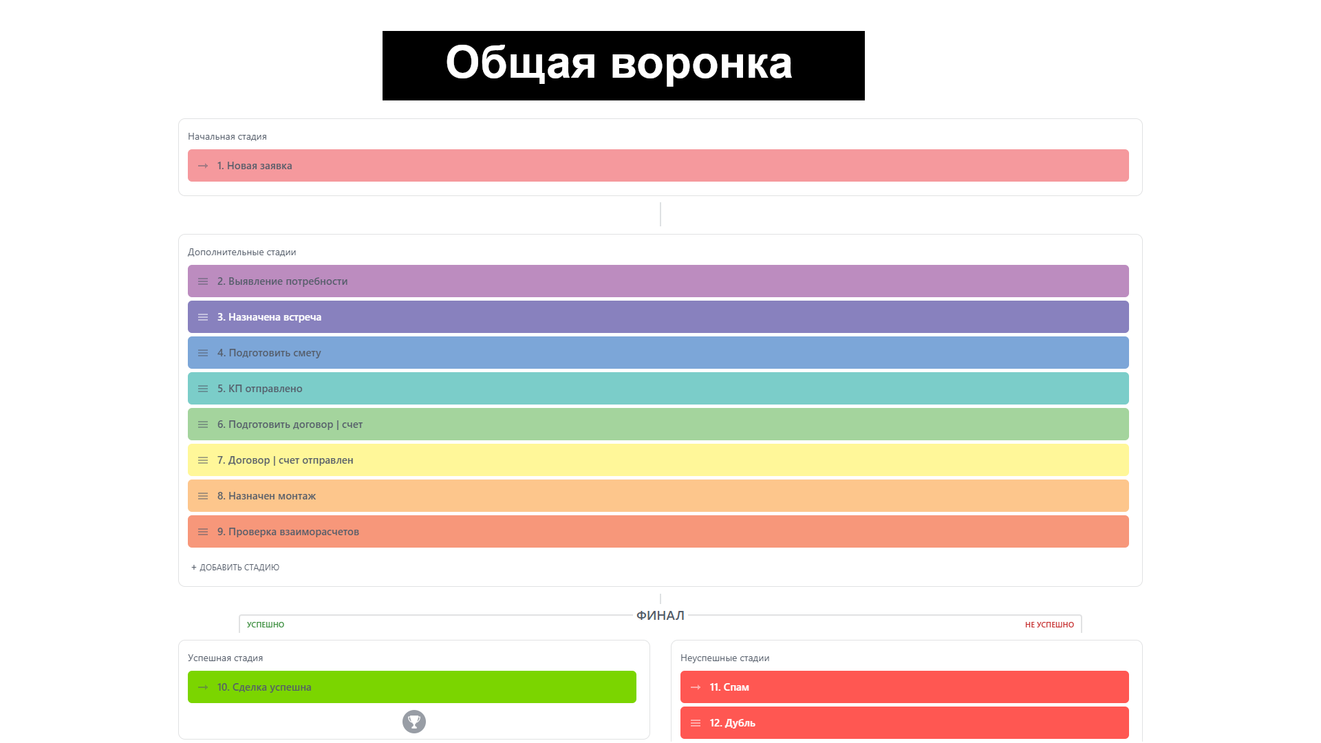 Финальный блок включает стадию "Сделка успешна" для успешно выполненных проектов, а также "Спам", "Дубль", "Нецелевой запрос", "Перестал выходить на связь", "Нашли других" и "Отпала потребность" для фильтрации нецелевых обращений. На этом этапе собирается обратная связь от клиента.