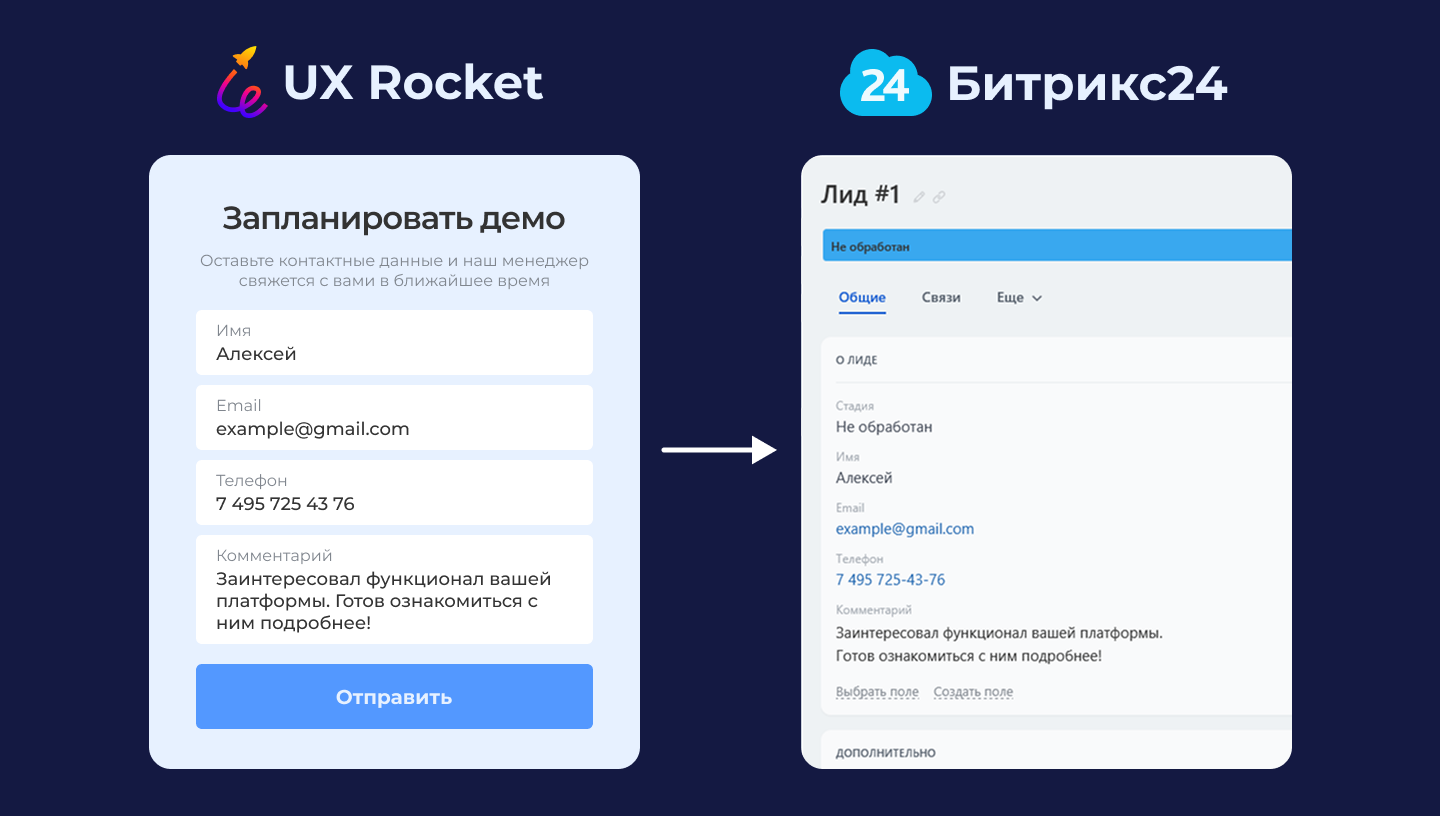 Интеграция UX Rocket с Битрикс24 позволяет автоматически создавать лиды в вашем Битрикс24 сразу после заполнения посетителем Web-формы UX Rocket на сайте. Все данные из полей виджета — имя, email, телефон и другие — мгновенно переносятся в карточку лида в соответствующие поля. Это обеспечивает моментальную обработку заявок, исключает потери данных и ускоряет работу с потенциальными клиентами. Вы можете гибко настраивать сопоставление полей формы и CRM для точной и бесперебойной синхронизации.