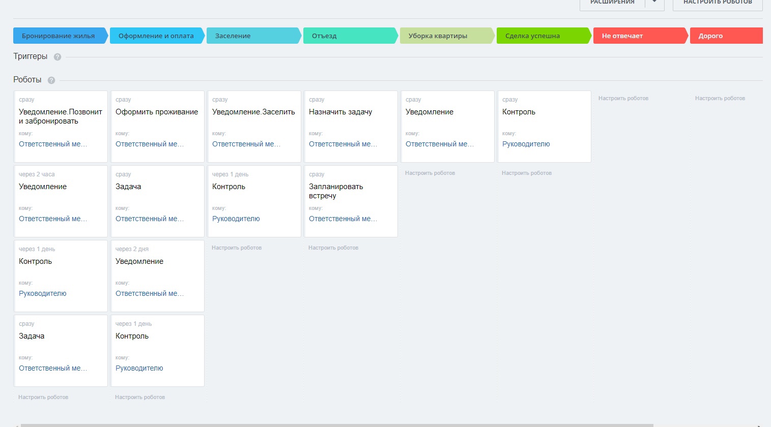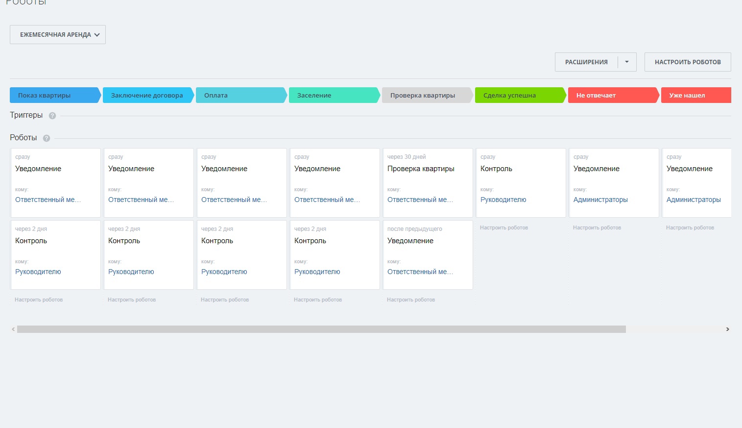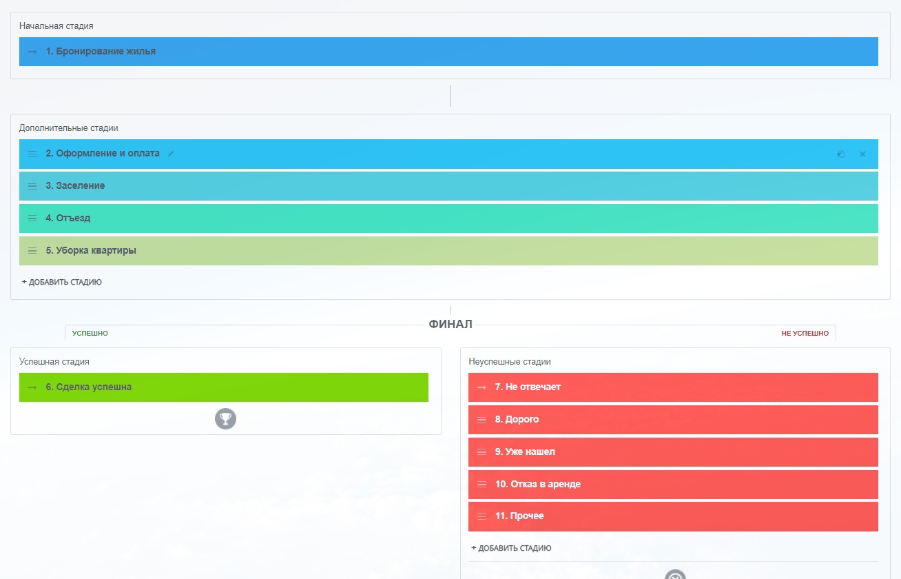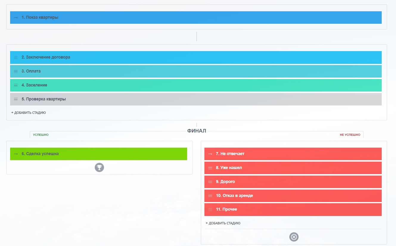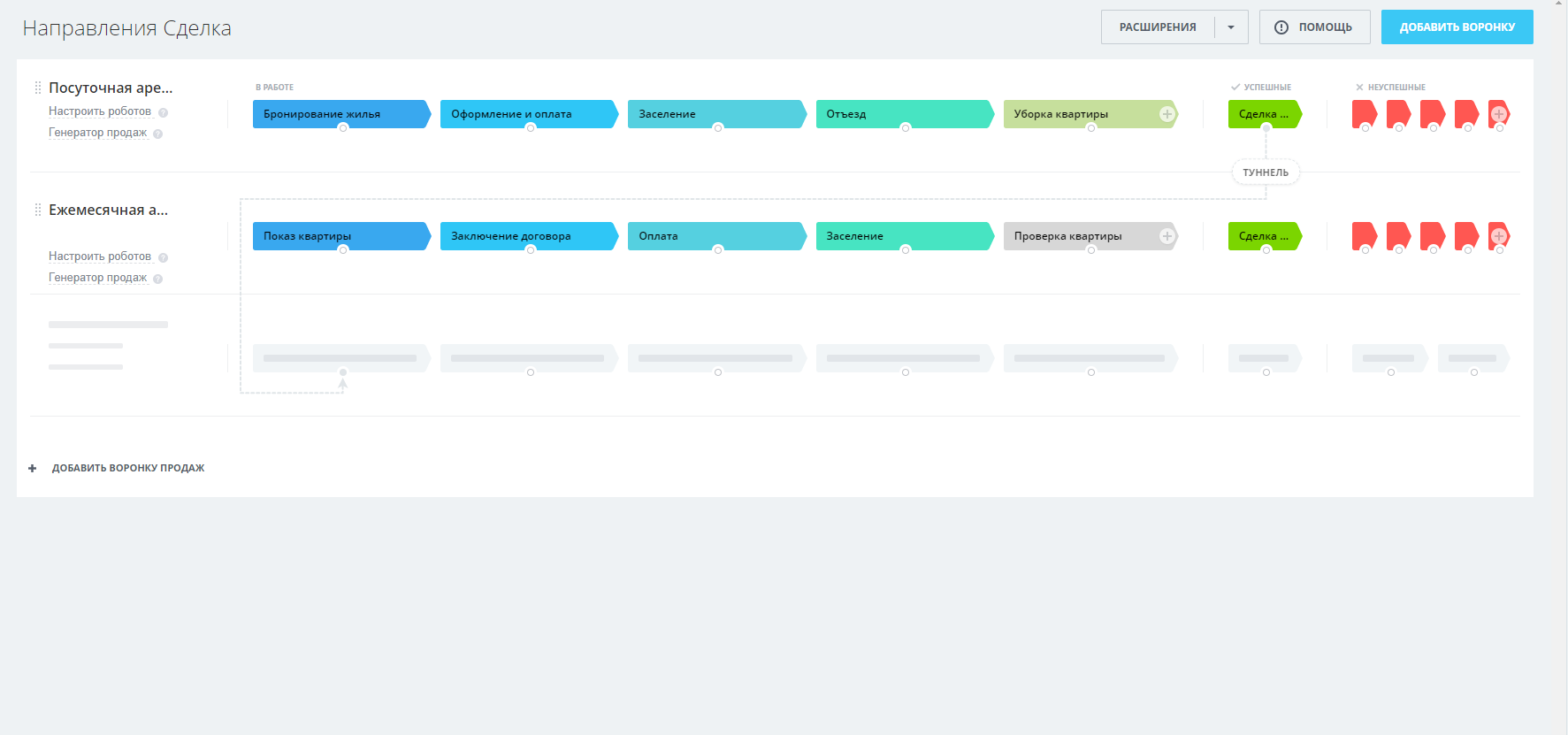 В нашем готовом решении CRM " Аренда квартир" предусмотрено 2 воронки продаж.