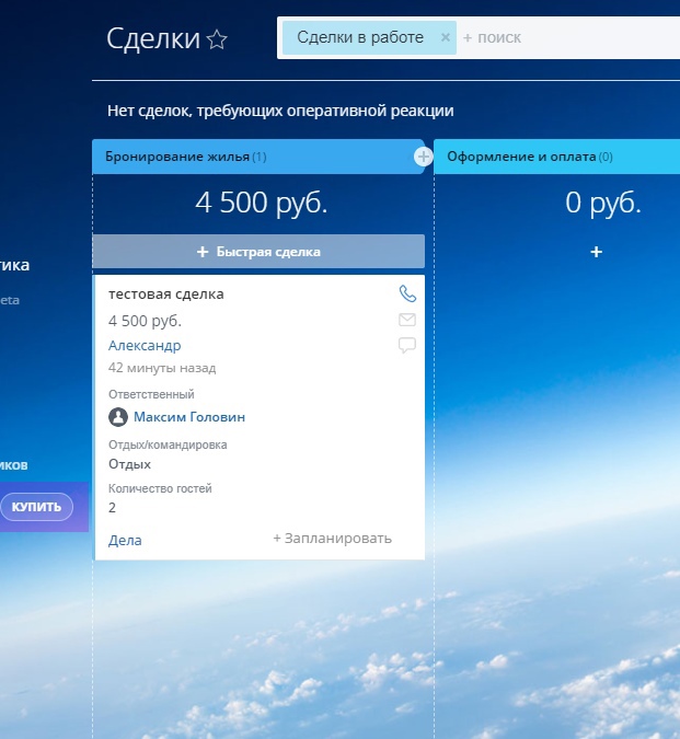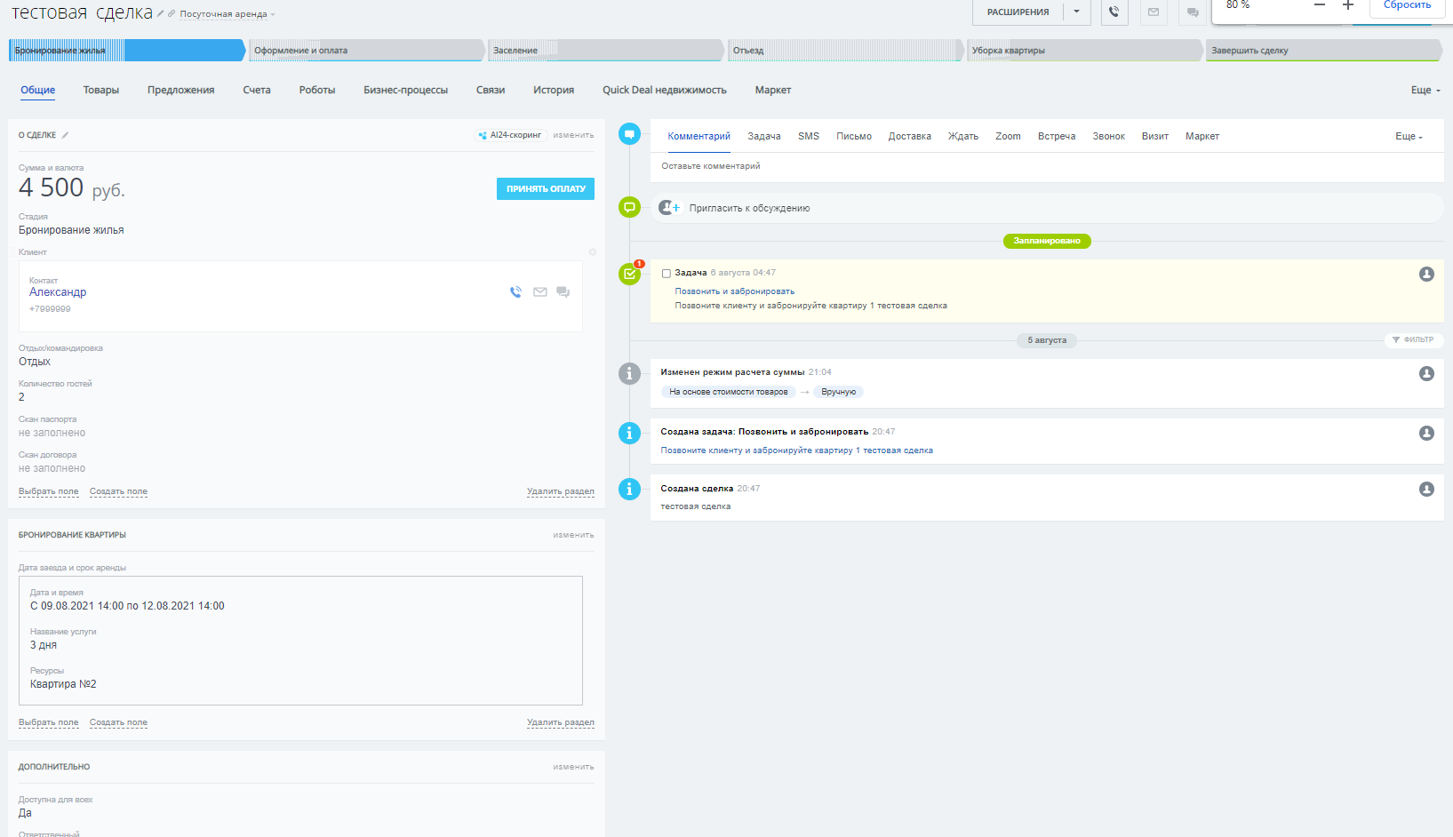 Отдельно отметим, что поля в карточке сделки созданы на основании потребностей агентства. И подходят для дальнейшего работы с клиентом в любом направлении.