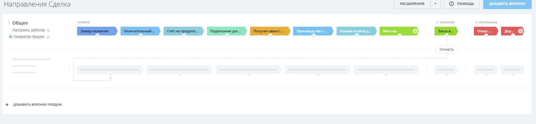 В нашем готовом решении CRM. "Кухни на заказ" предусмотрена одна основная воронка продаж: