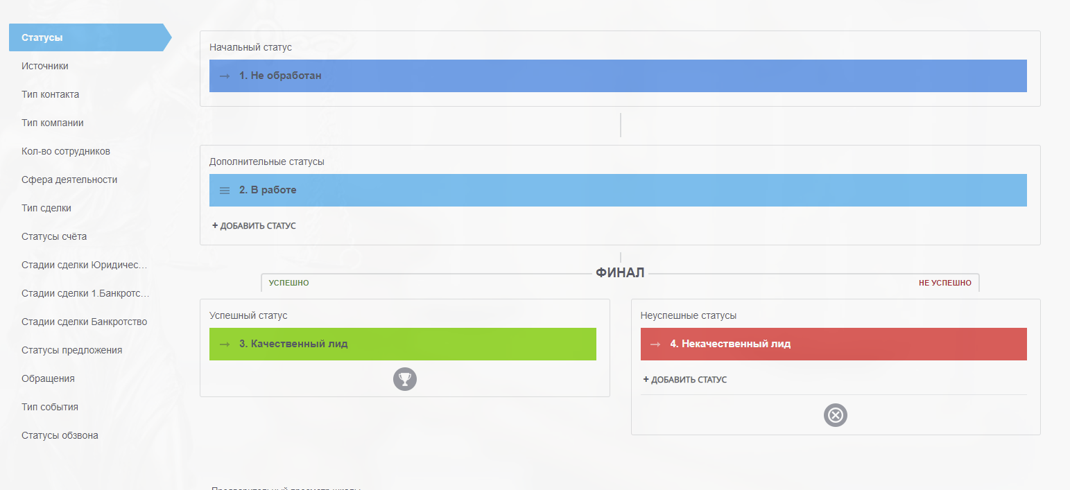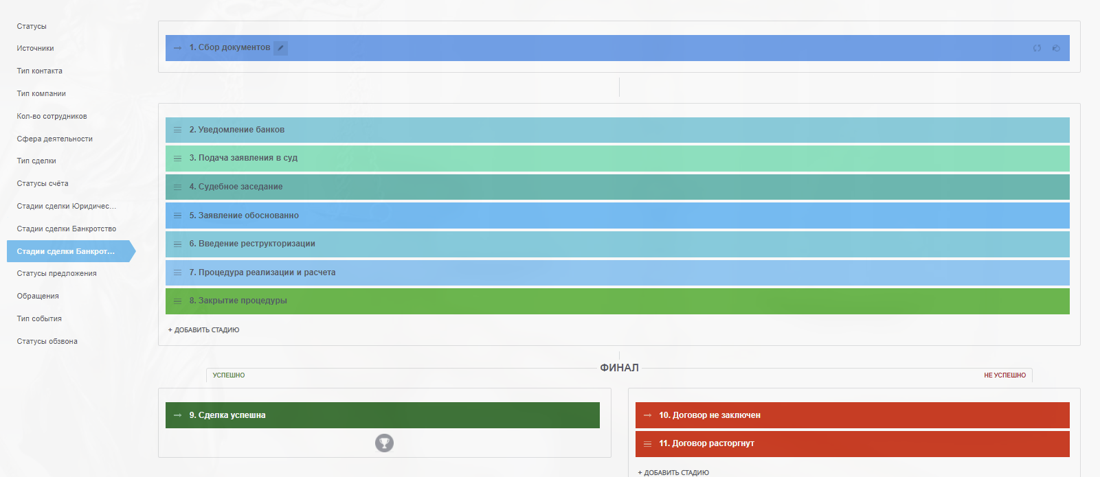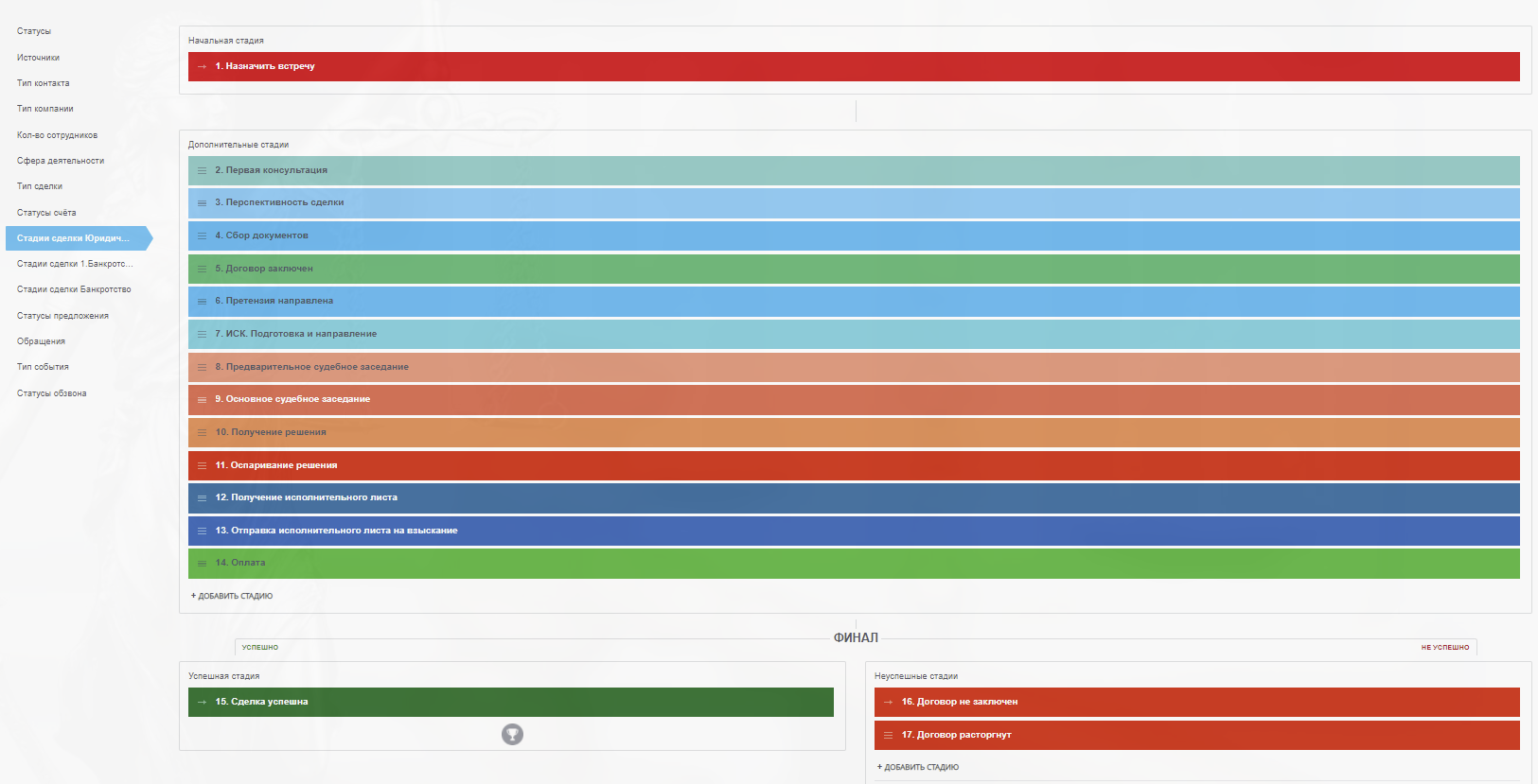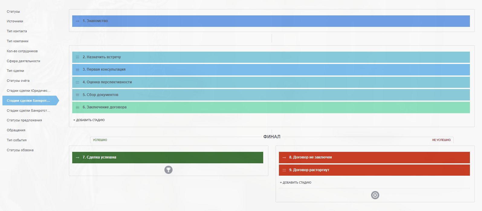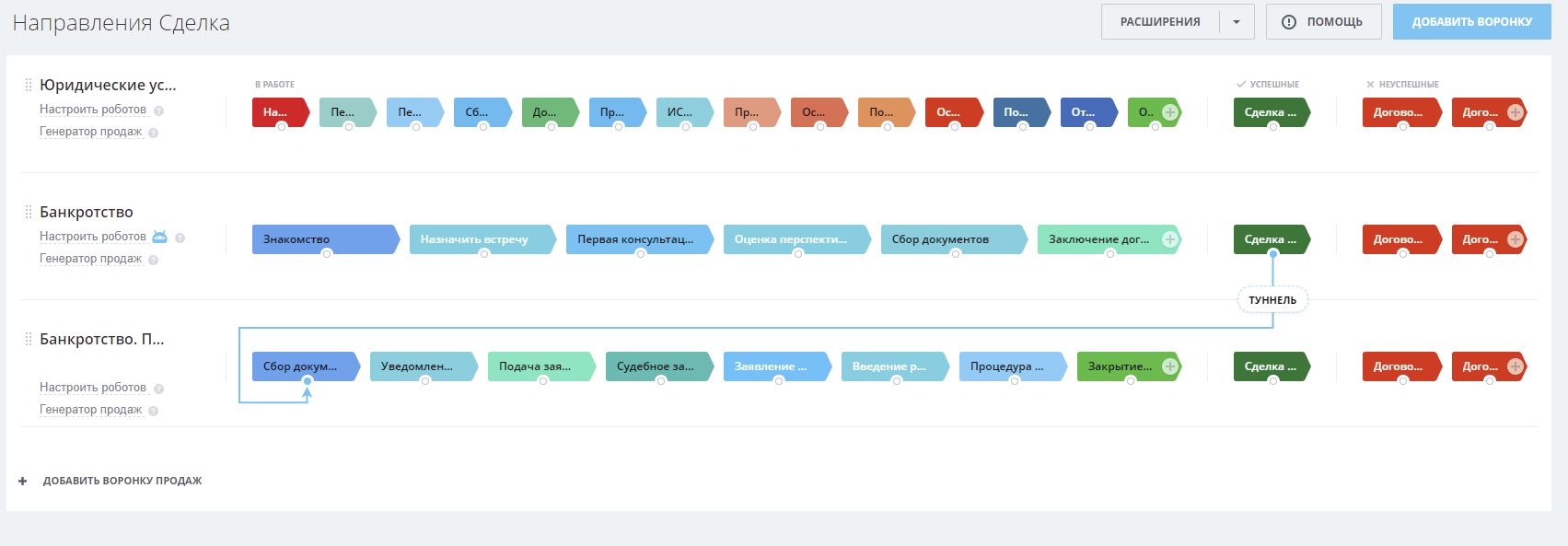 В нашем готовом решении CRM "Юридическая компания и Банкротство физ. лиц" предусмотрено 3 воронки продаж: