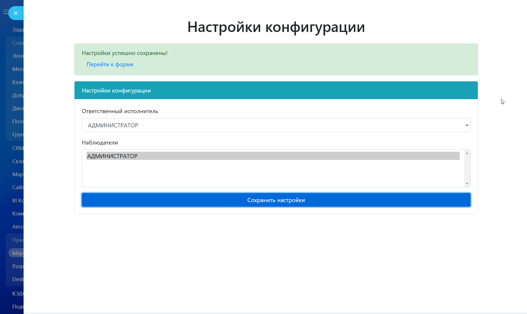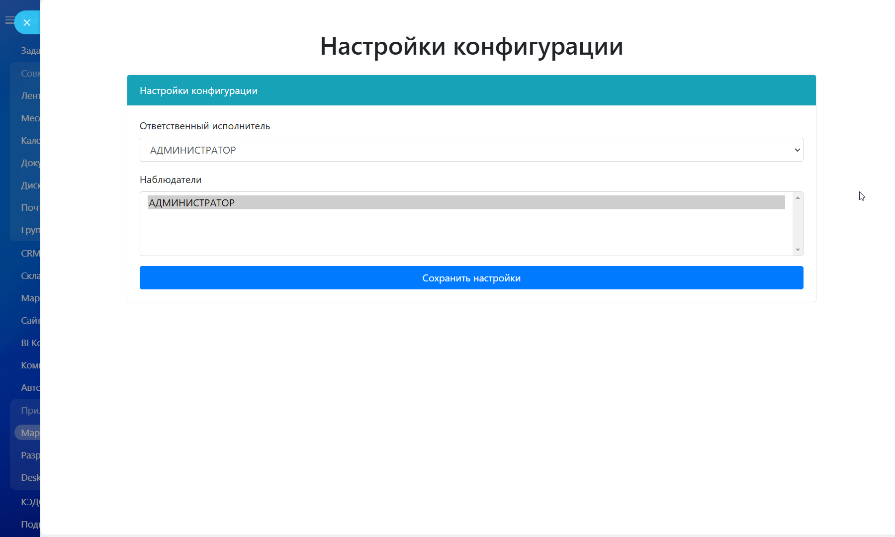 - Настраиваемое назначение — при первом запуске возможность указать ответственных и наблюдателей из списка сотрудников.