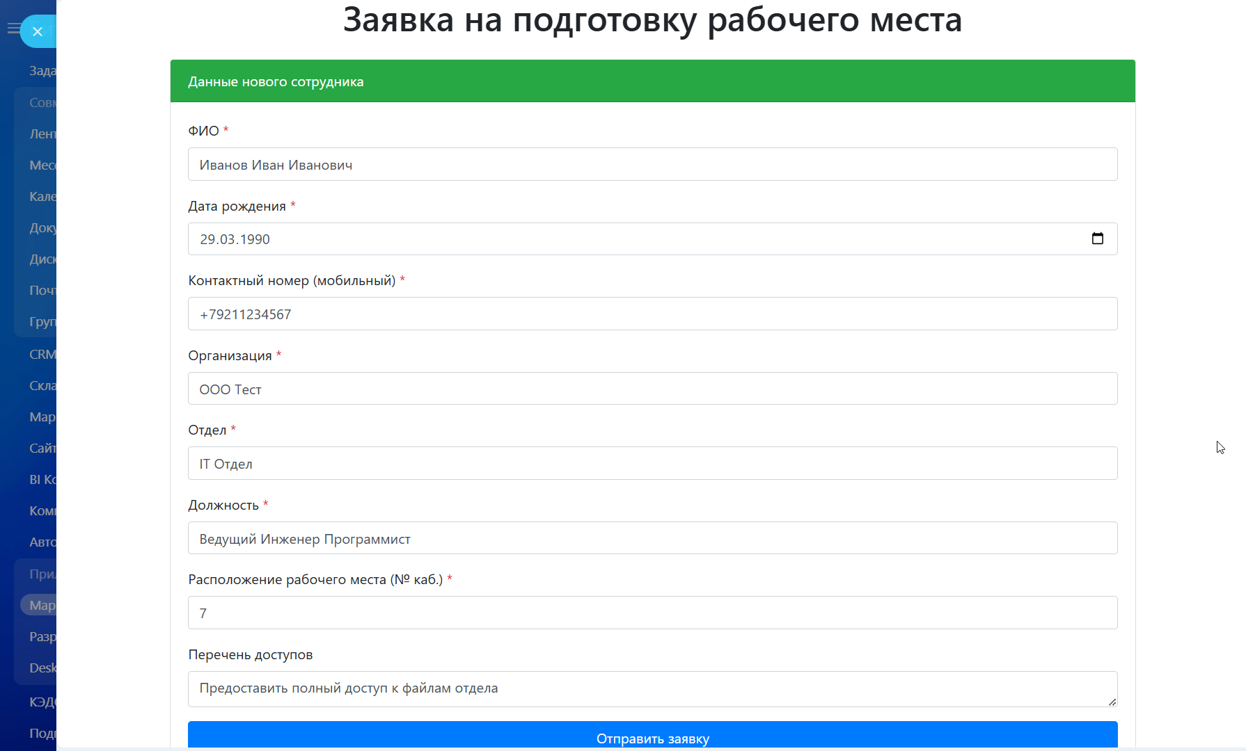 - Сбор данных через форму — удобный сбор данных, таких как ФИО, дата рождения, контактный номер, организация, отдел, должность, расположение рабочего места и перечень необходимых доступов.