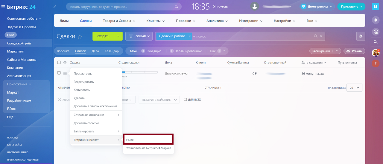 1. После включения подписания документов для раздела (сделка, лид, компания или контакт) доступны пункты меню «F.Doc» для вызова страницы подписания документов: