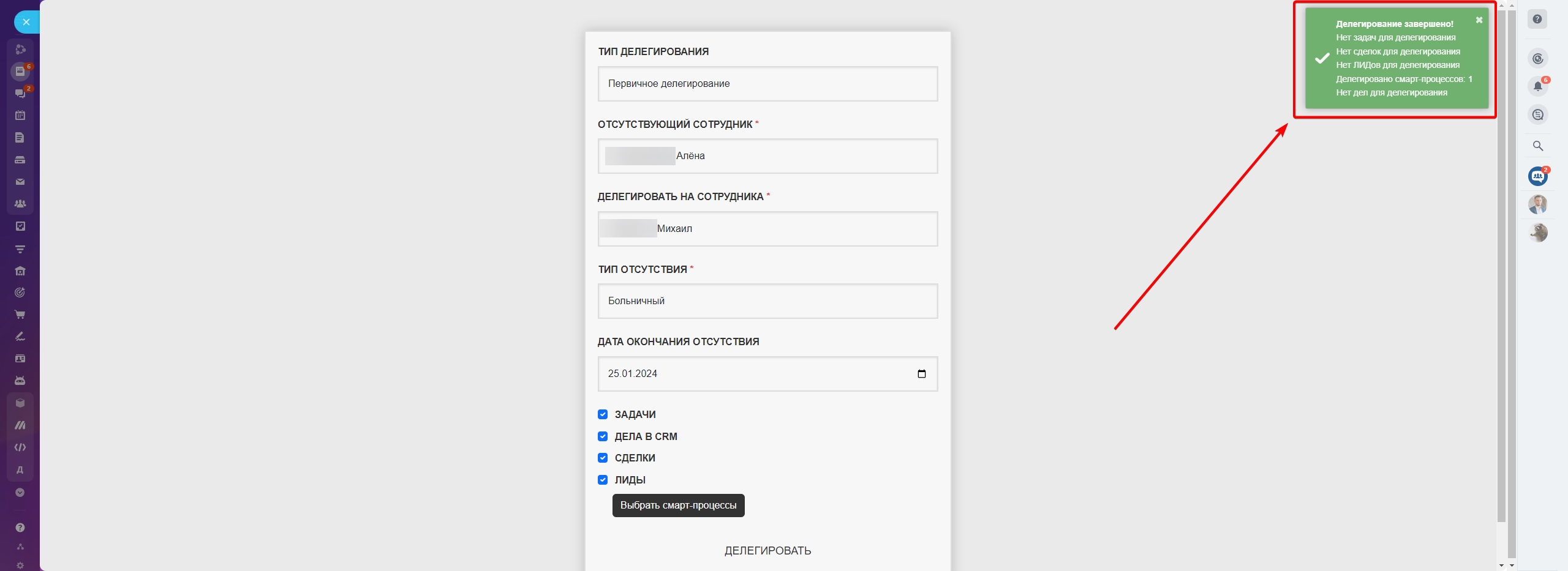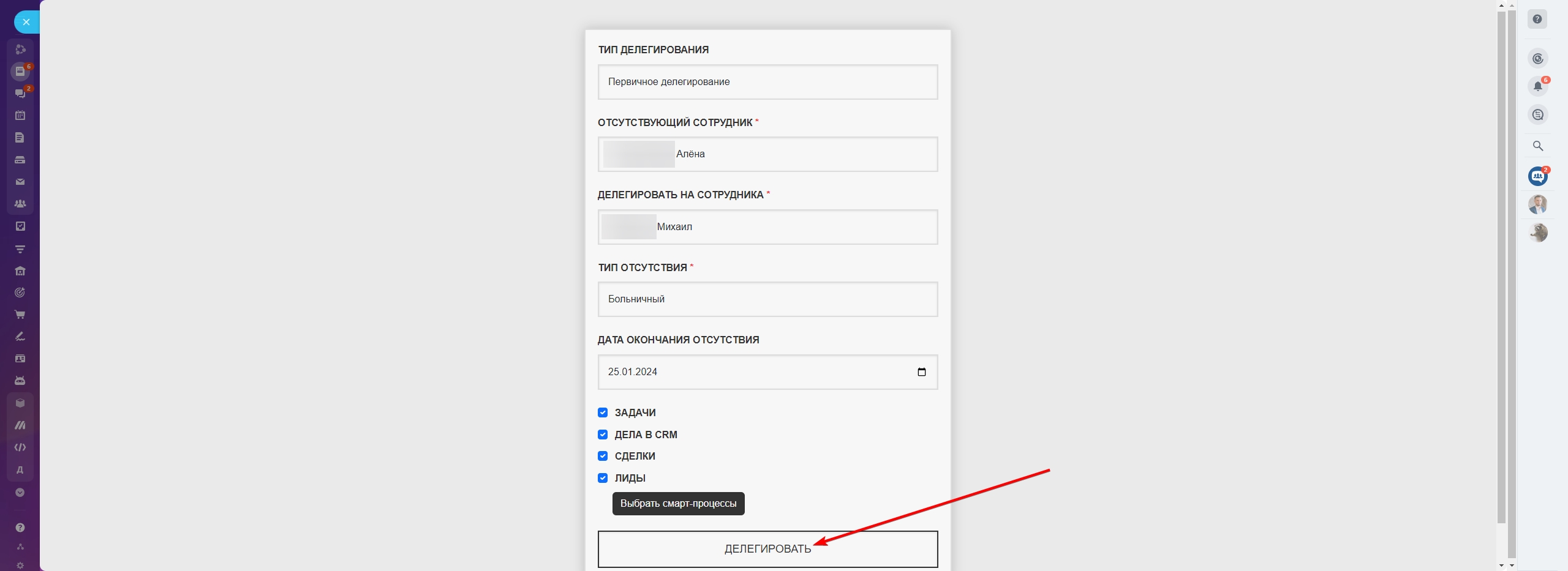 Бит.Делегирование - ваш надежный инструмент для передачи задач, сущностей CRM и смарт-процессов на время отсутствия сотрудника или увольнения.