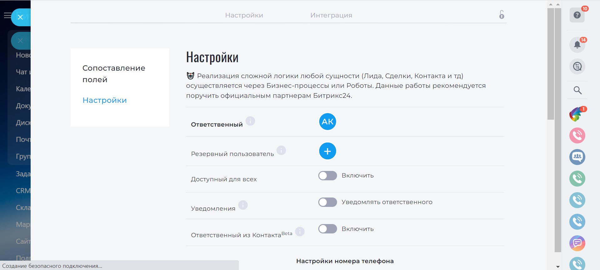- Поиск существующих контактов и компаний (по телефону и/или почте);