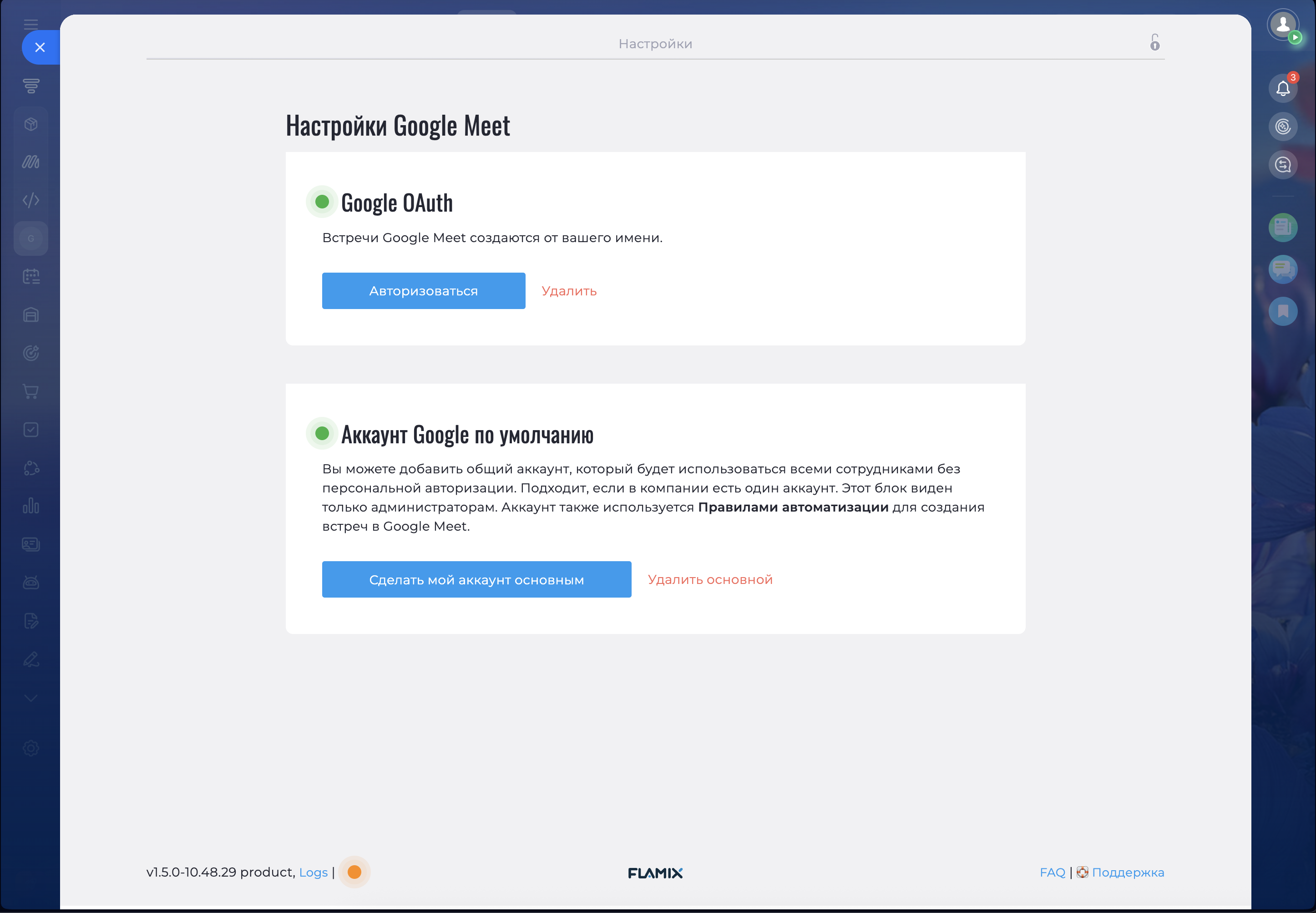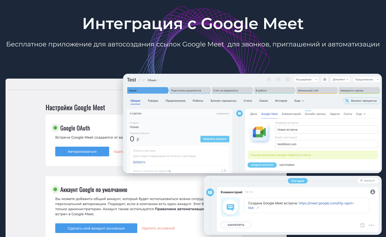 Робот автоматизации: Автоматически создавайте ссылки Google Meet на определённых стадиях CRM — удобно для подготовки звонков с клиентами или коллегами.