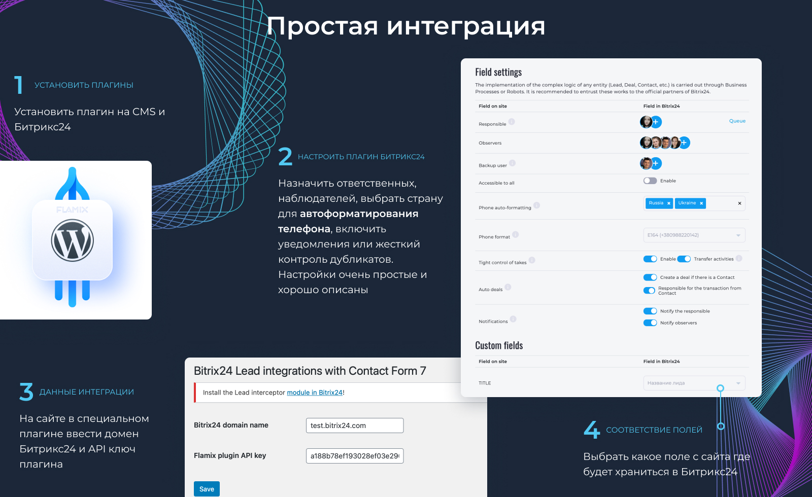 - Синхронизация форм и заказов (поля, товары, скидки, валюта);