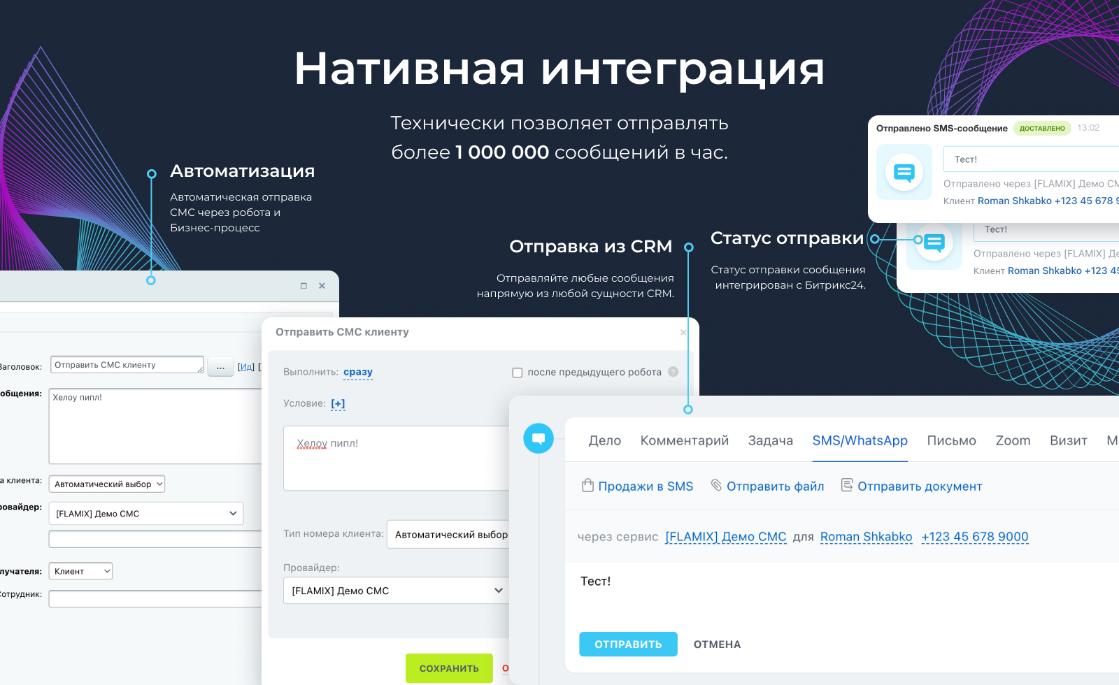 - Проверка и отображение статуса доставки сообщения непосредственно в CRM (доставлено сообщение или нет);