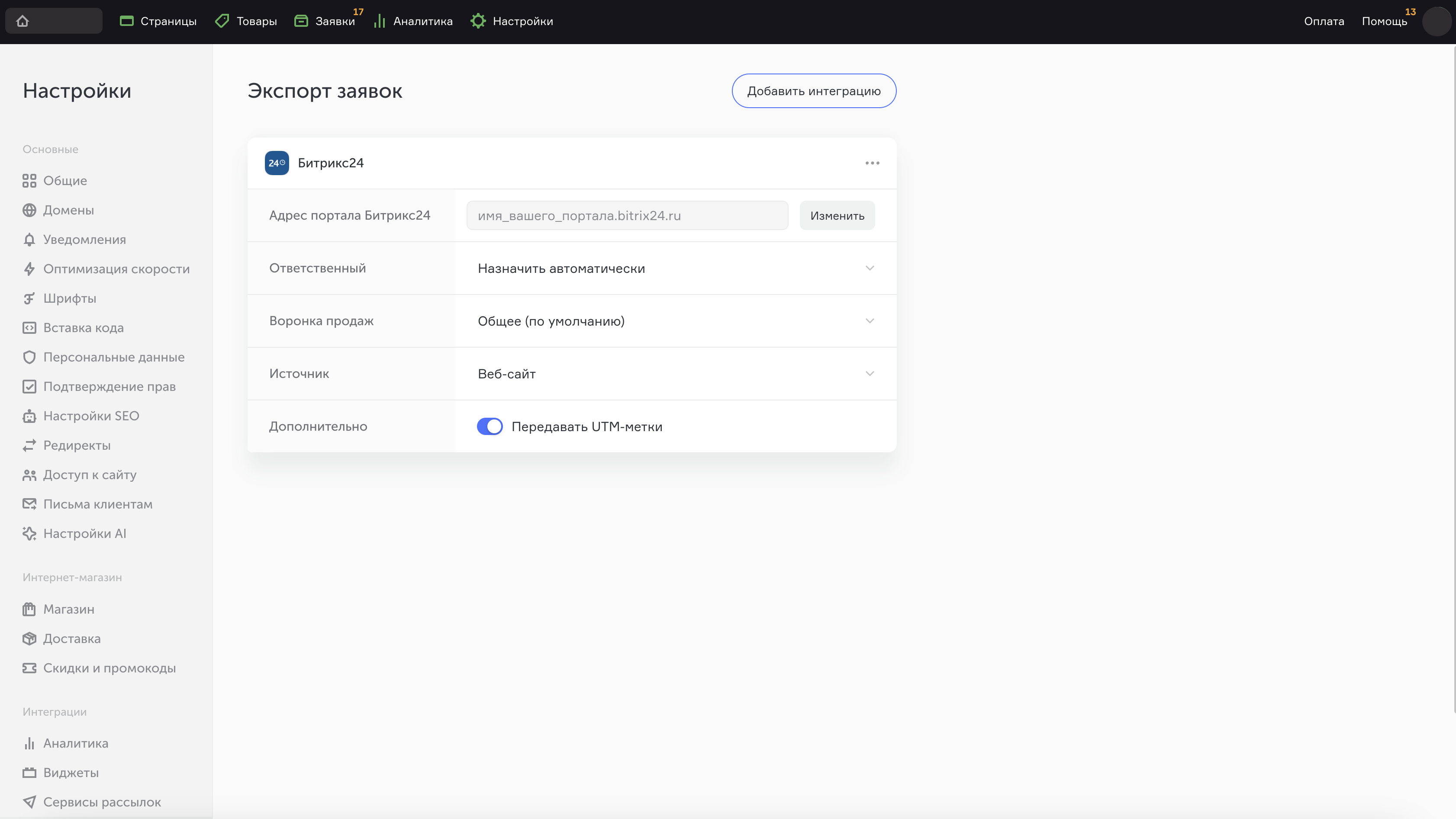3. В разделе Сайты выберите нужный сайт и перейдите в раздел «Настройки» – «Экспорт заявок», выберите «Битрикс24».