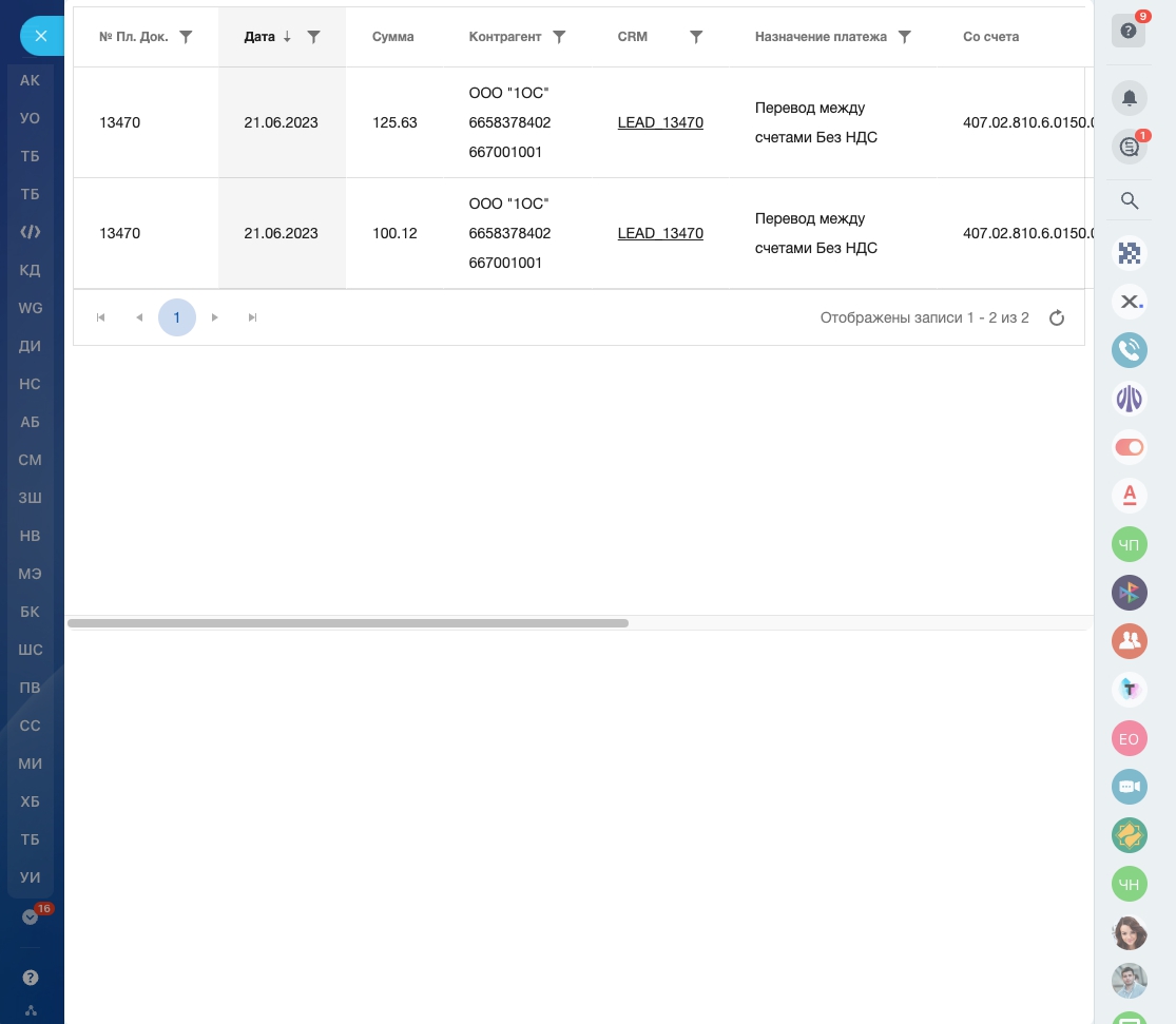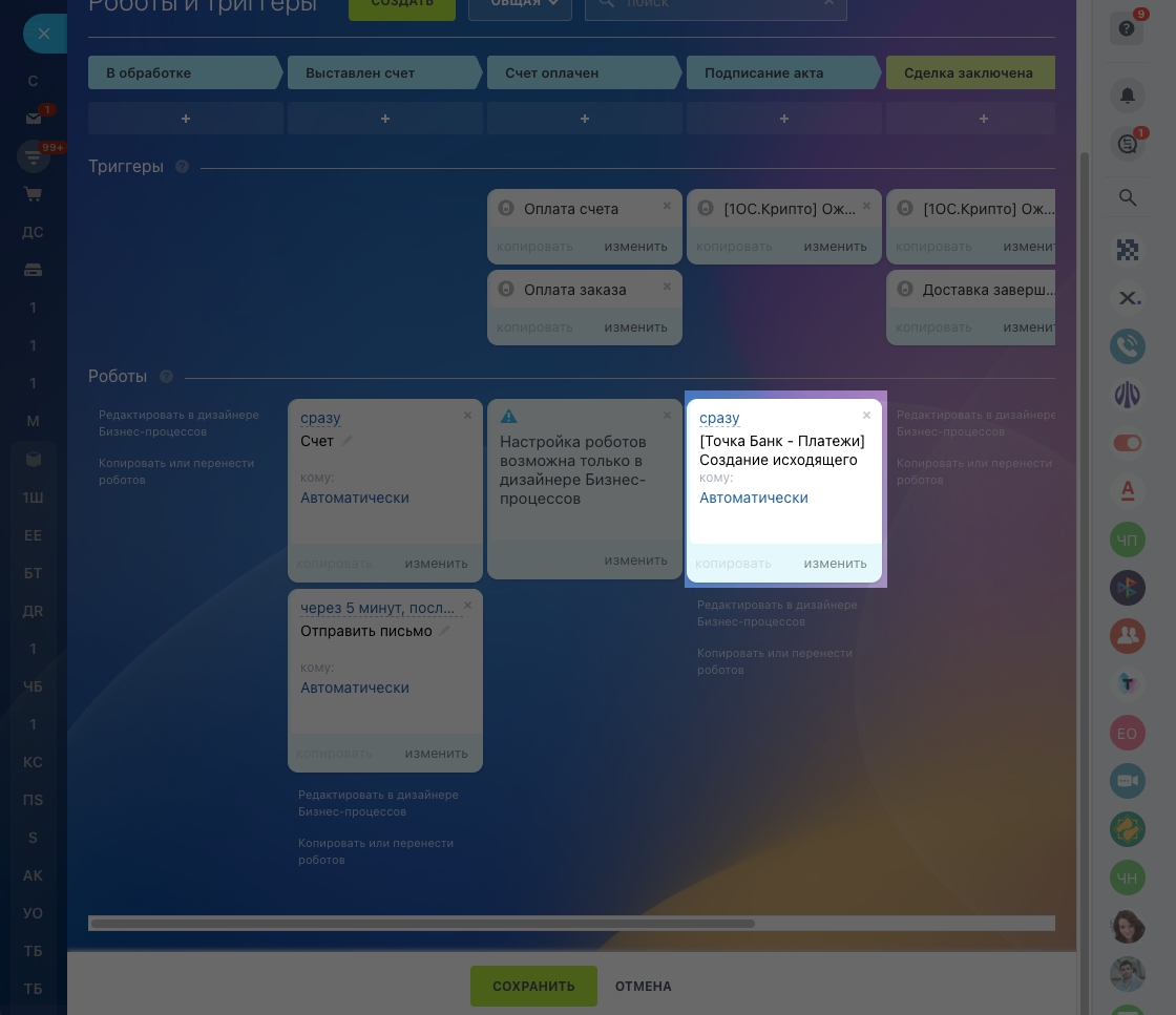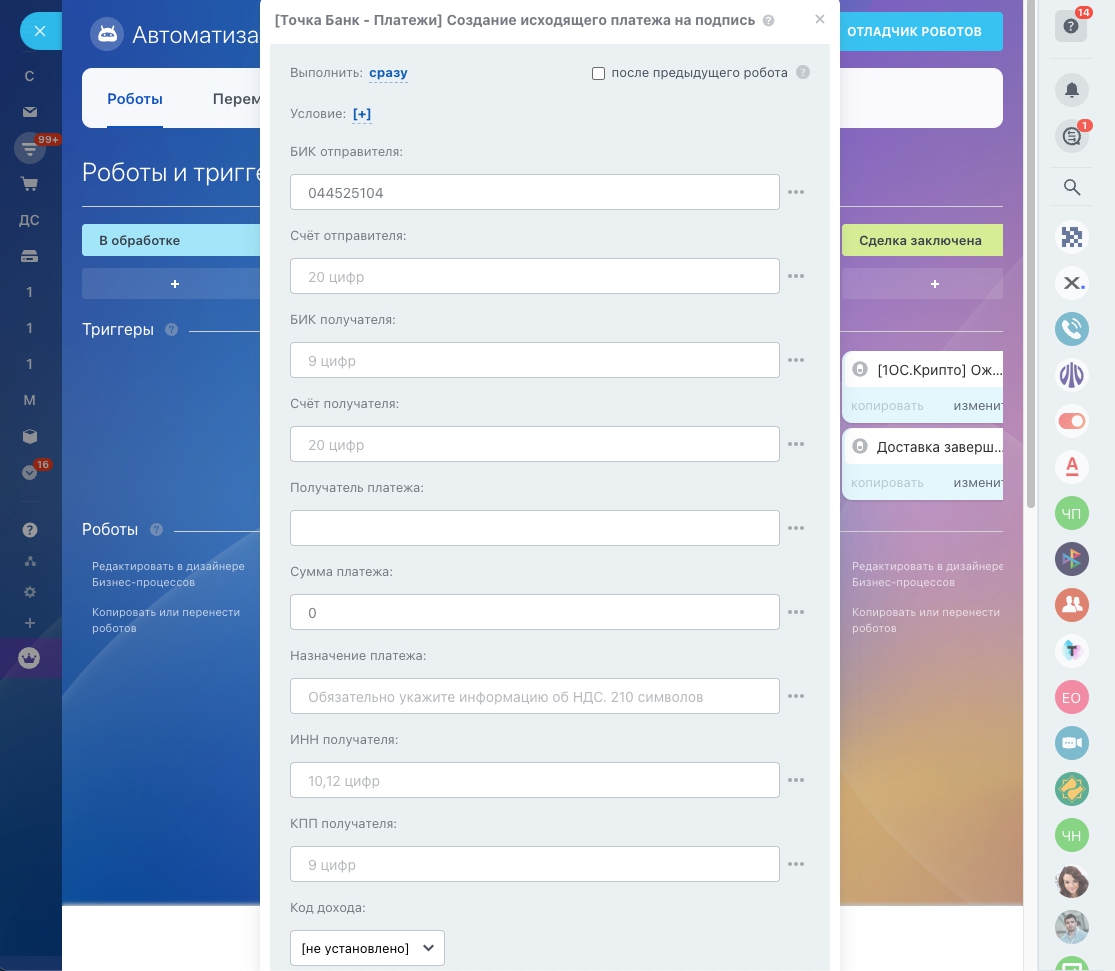 Приложение добавляет CRM Роботов для отправки платежек в Банк