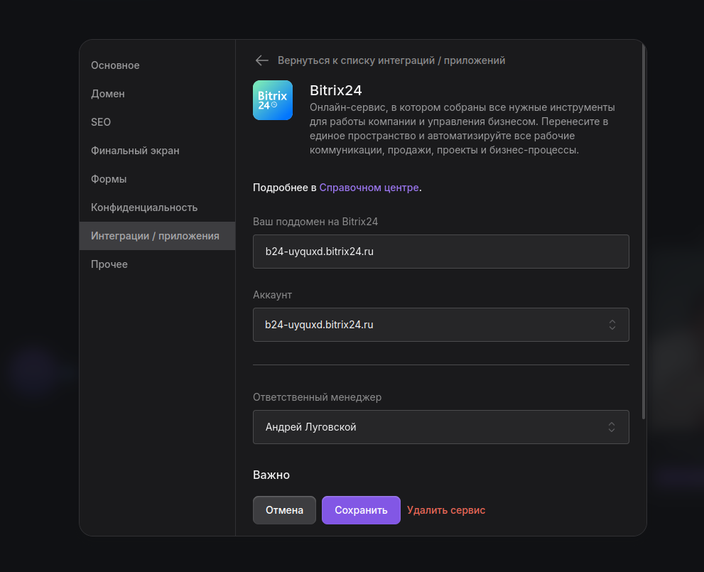 А так же позволяет назначить ответственного менеджера на кого будут создаваться лиды.