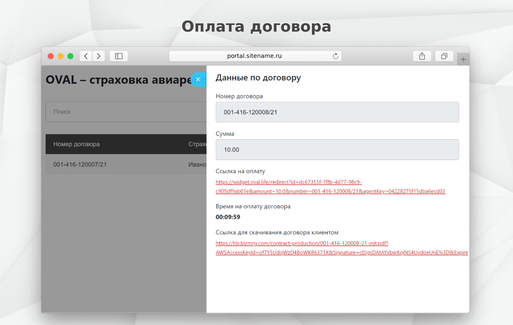 Приложение автоматически сформирует страховой договор и система вышлет ссылку на оплату, действующую в течение 10 минут.