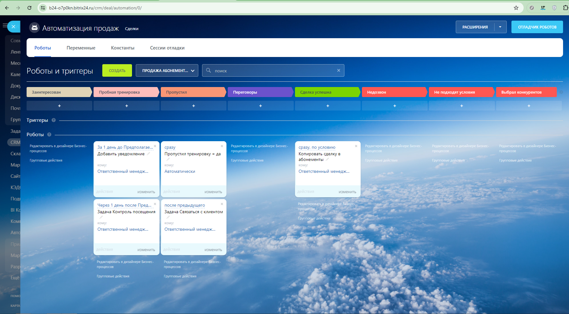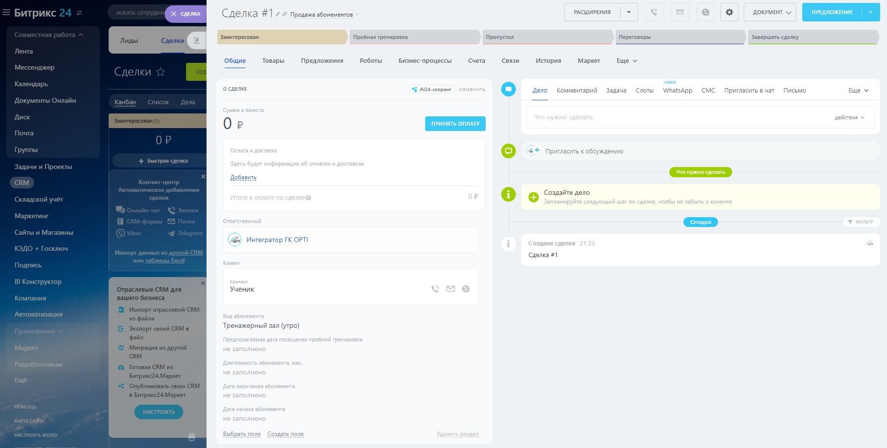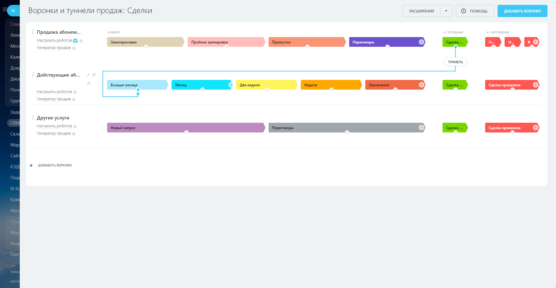 - Сделка успешна. При завершении Сделки создаётся копия в воронке "Действующие абонементы".