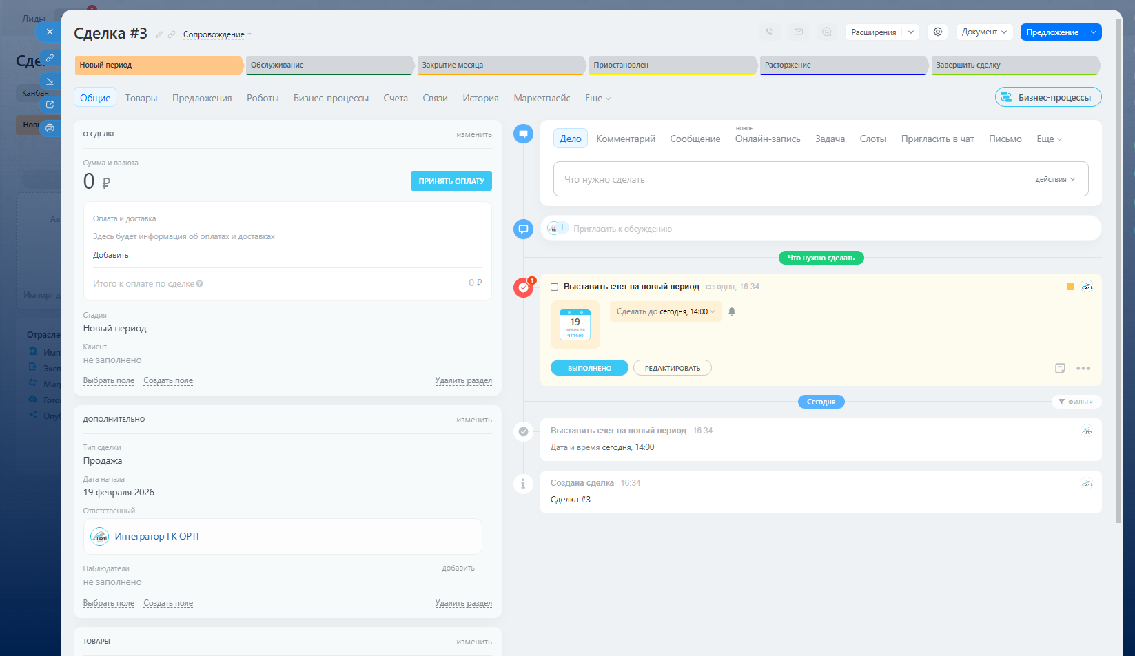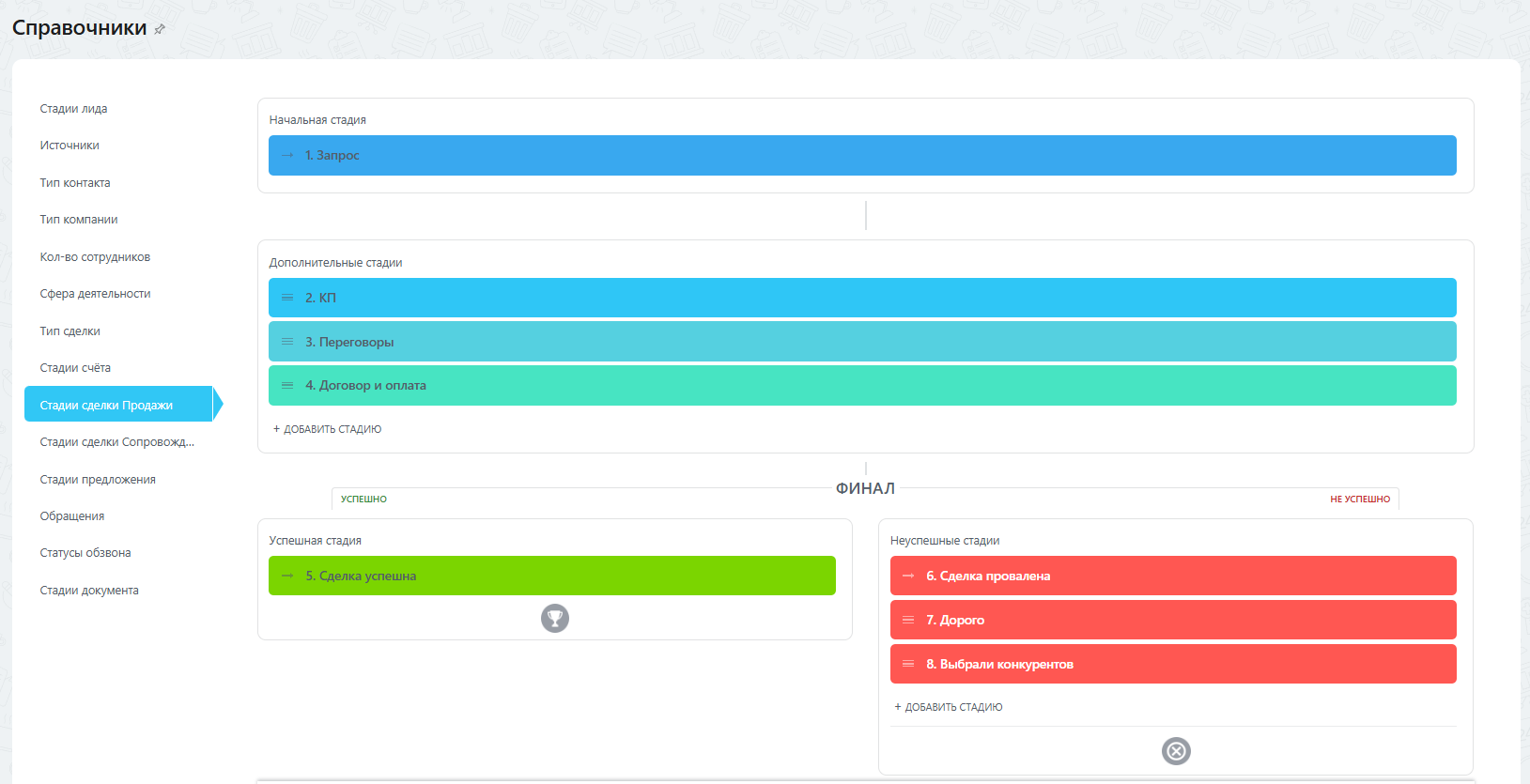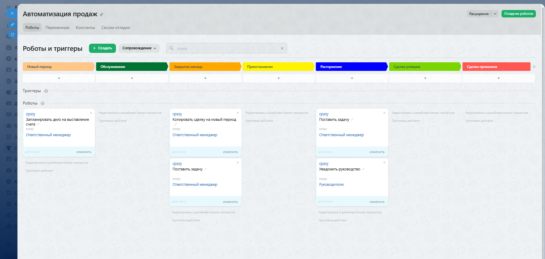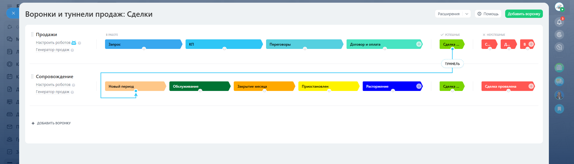 Сделка провалена/Дорого/Выбрал конкурентов - Настройка воронки сопровождения: Новый период - Обслуживание - Закрытие месяца - Приостановлен - Расторжение - Сделка успешна/Сделка провалена