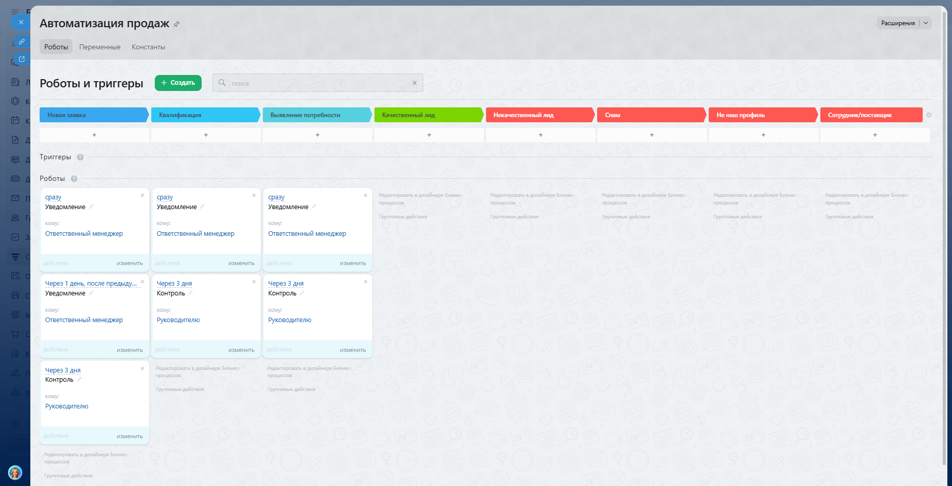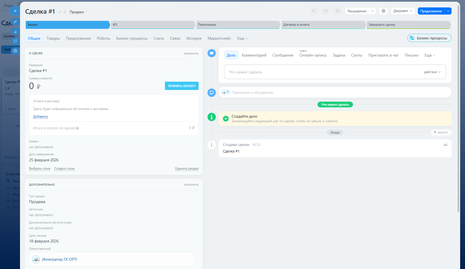 - Настройка воронки продаж под этапы: Запрос - КП - Переговоры - Договор и оплата - Сделка успешна