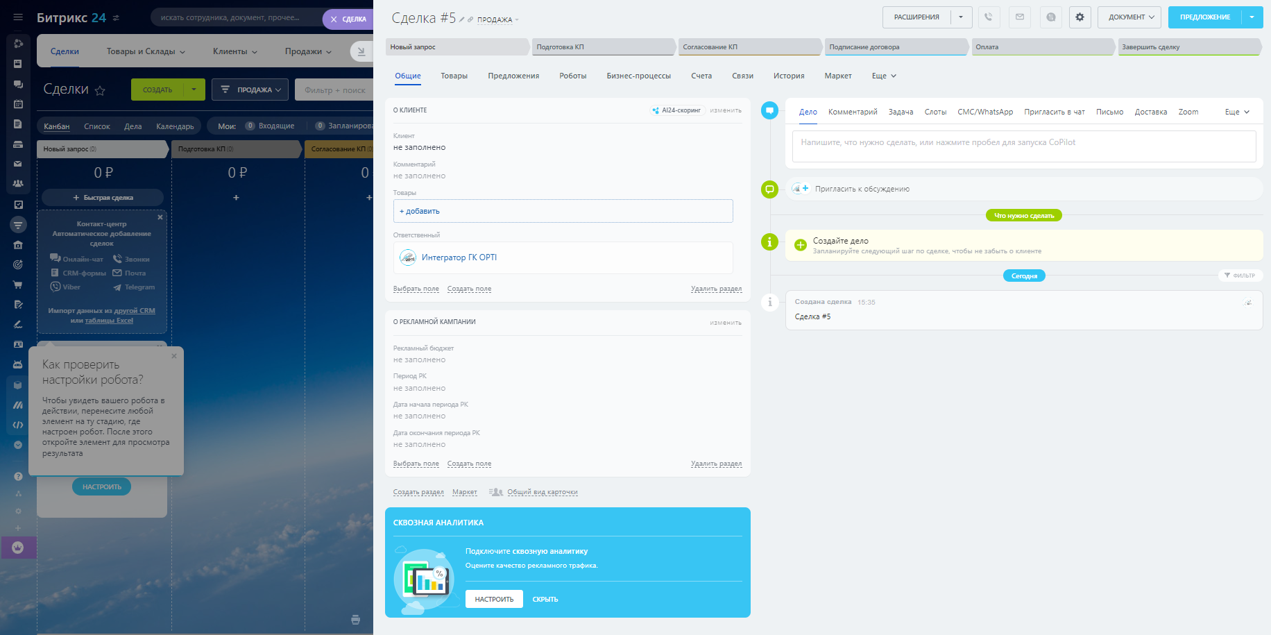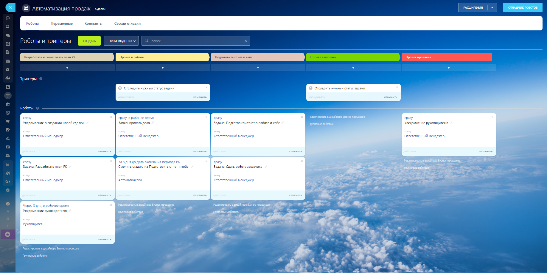 В воронке «Производство» на стадии «Разработать и согласовать план РК» отправляется уведомление ответственному сотруднику о новой Сделке. Также на этом этапе ставится задача на ответственного «Разработать план рекламной кампании», крайний срок +3 дня. После завершения задачи происходит автоматическая смена стадии на «Проект в работе». Если Задача в течение 3-х дней не будет завершена, отправляется контроль руководителю.