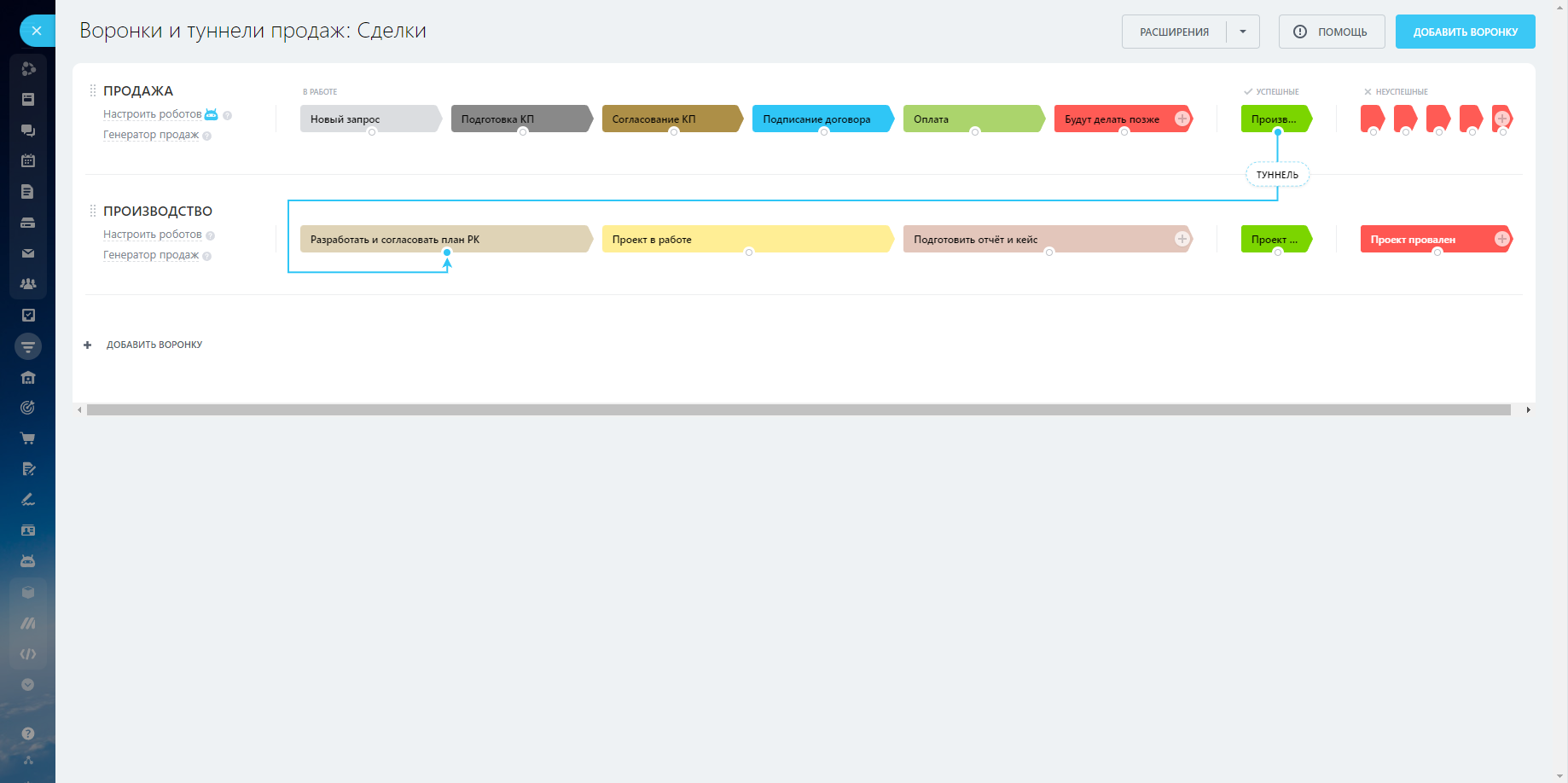 CRM для вашего бизнеса полностью настроена. При настройках учли все этапы Сделки. Созданы воронки сделок: · Продажа · Производство