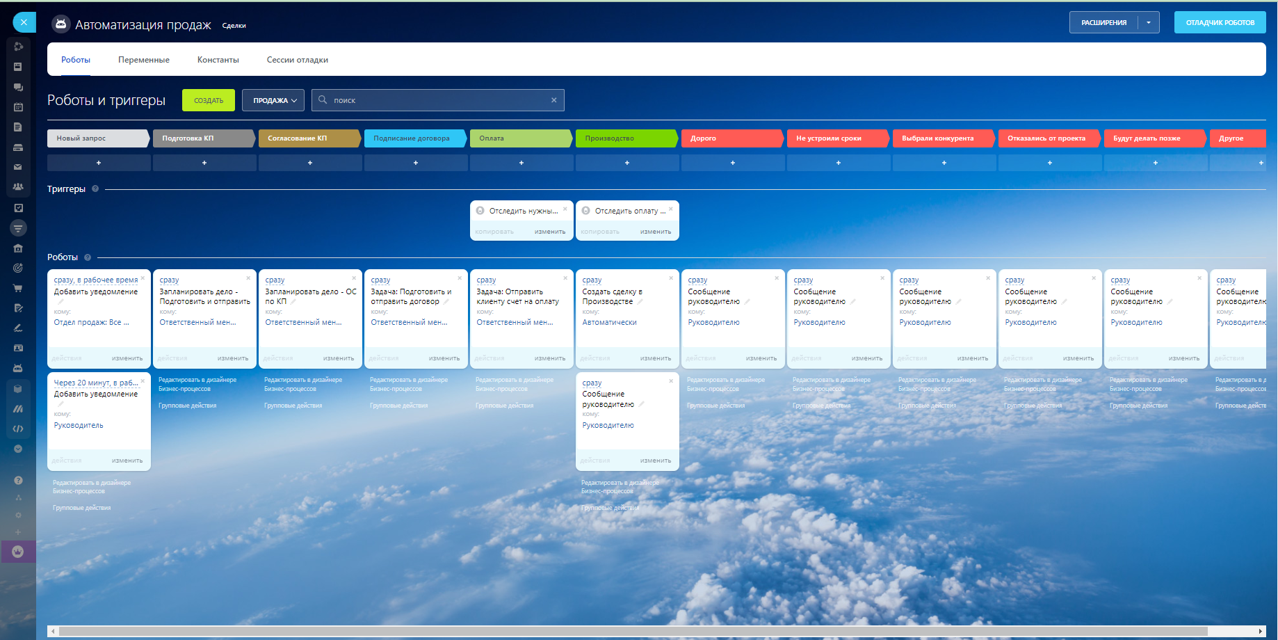 На стадии «Оплата» ставится задача «Отправить клиенту счет на оплату по договору». После того, как счёт поменяет стадию на «Оплачен», происходит смена стадии на «Производство».