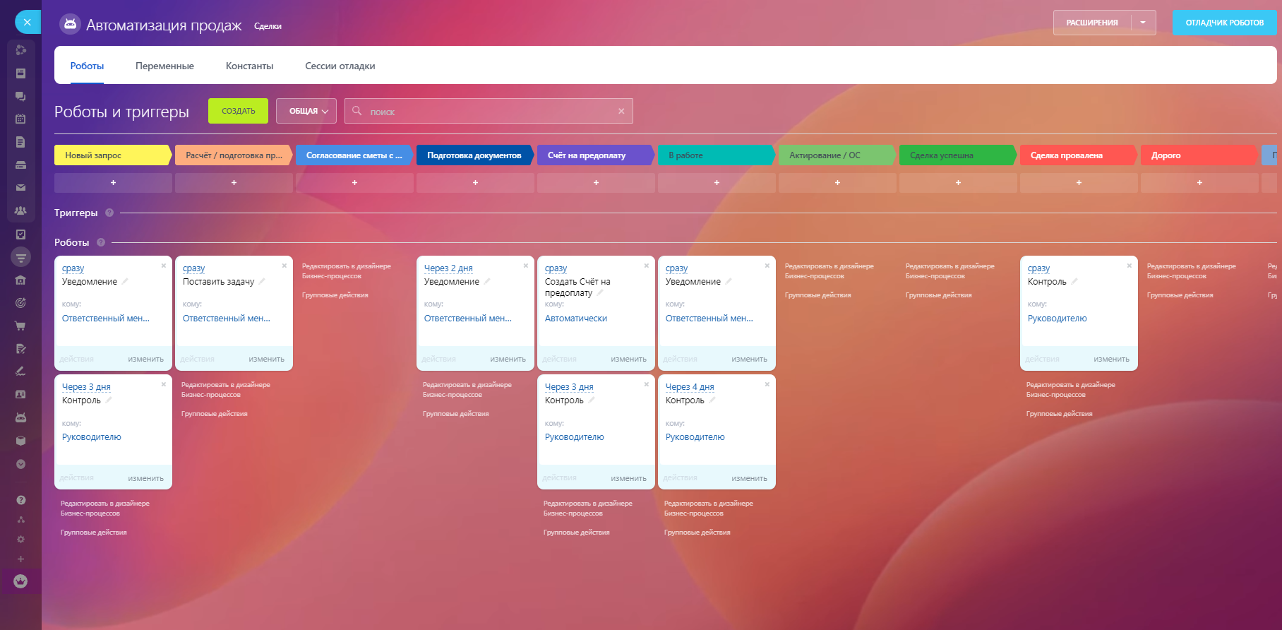 На стадии «Новый запрос» отправляется уведомление ответственному сотруднику. Через 3 дня отправляется уведомлению руководителю о том, что сделка на данной стадии находится уже 3 дня.