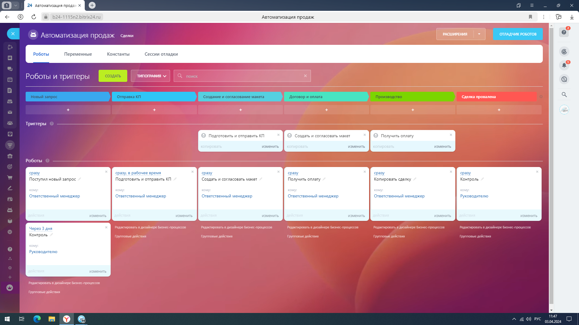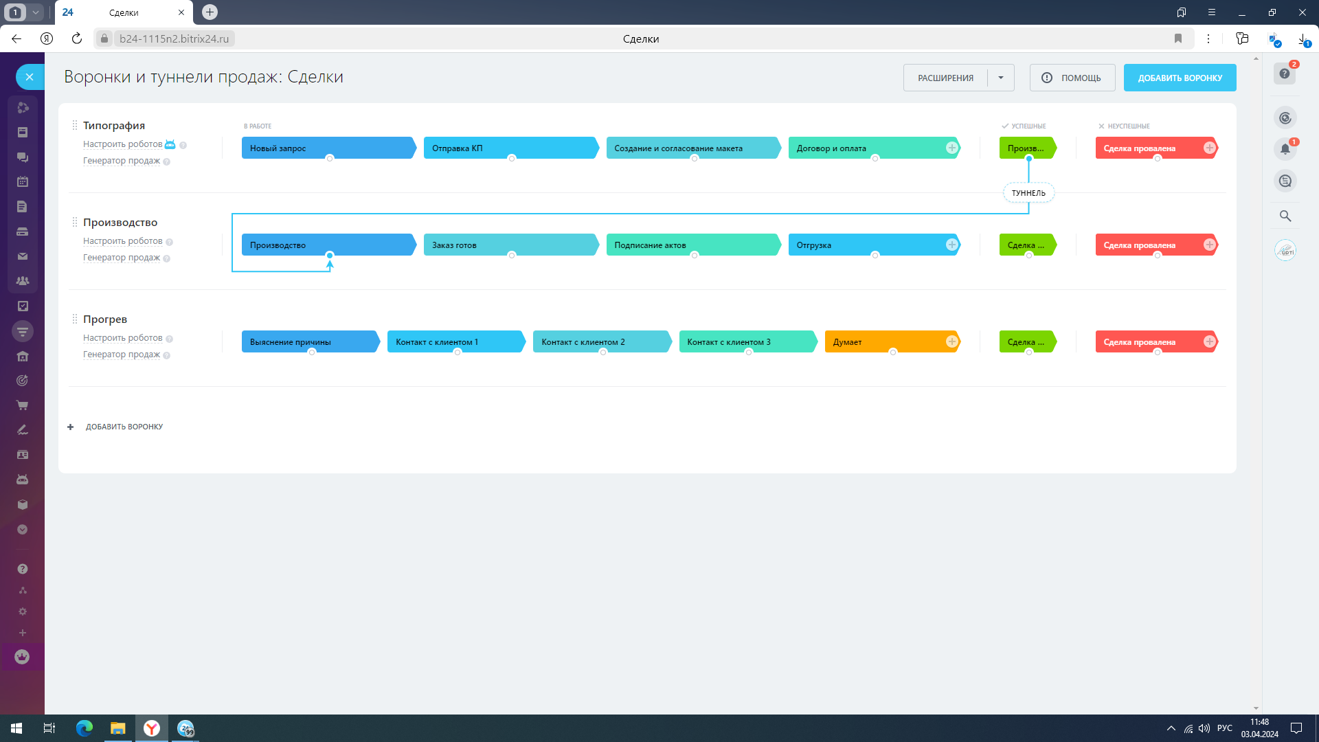 Вы получите уже настроенную CRM. В данной CRM настроены и учтены все этапы Сделки. Несколько готовых воронок: · Типография · Производство · Прогрев