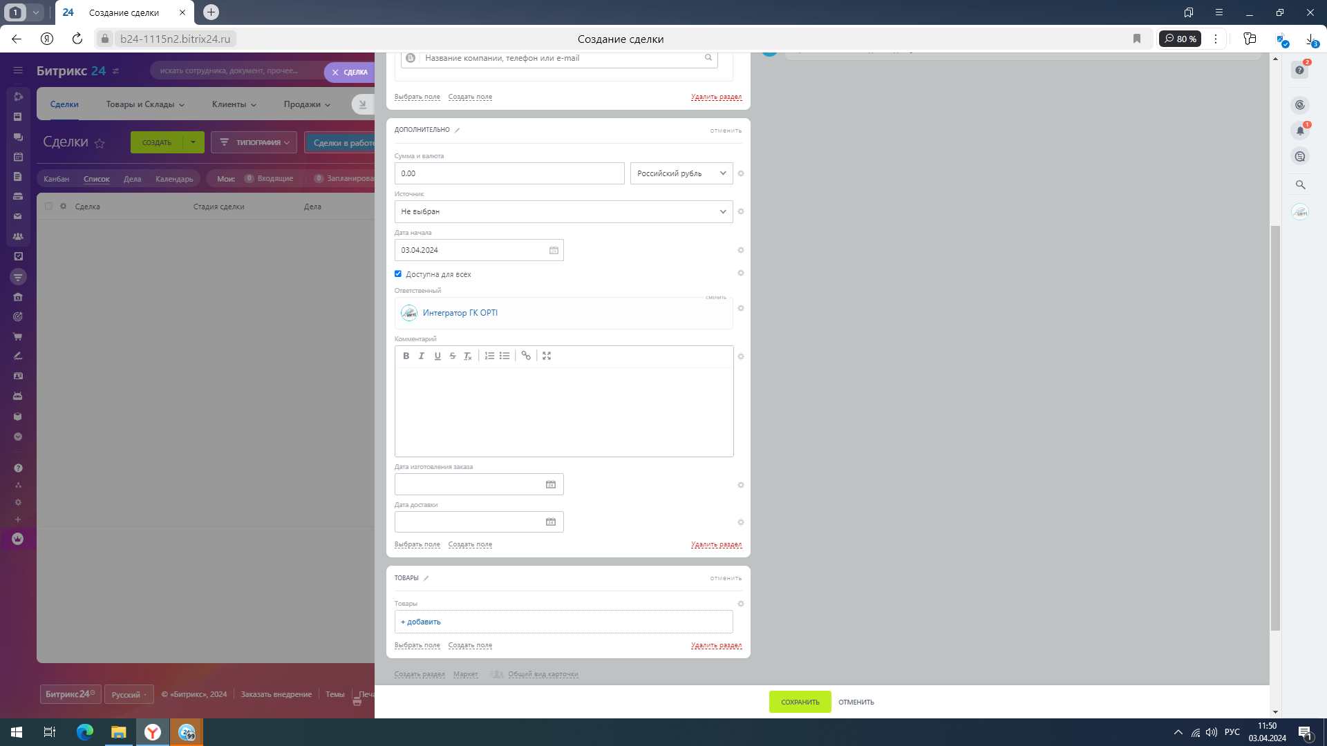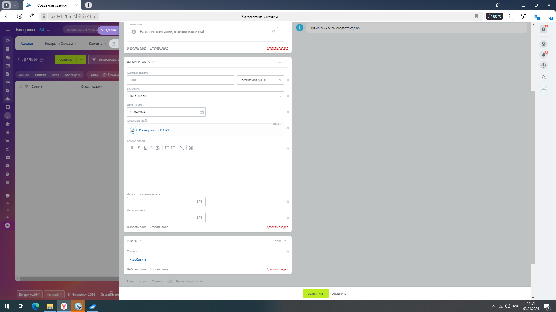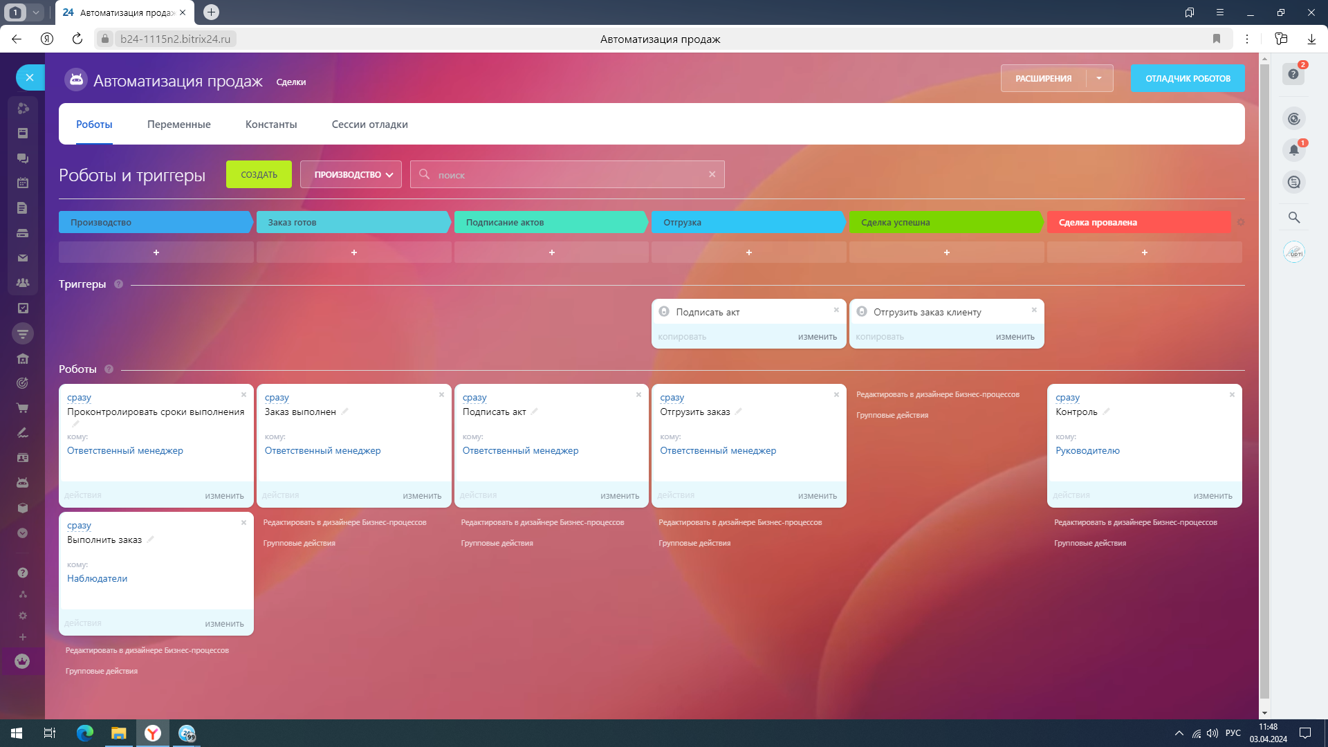 В воронке «Производство» на стадии «Производство» ставится задача на ответственного «Проконтролировать сроки выполнения заказа». После того, как заказ будет готов, нужно передвинуть сделку на следующую стадию.