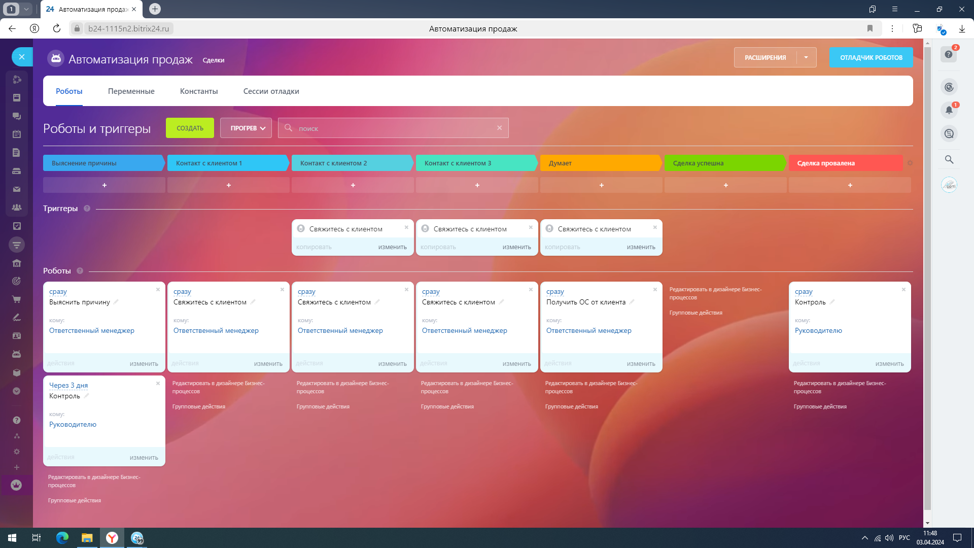 На стадии «Контакт с клиентом 3» ставится задача на ответственного сотрудника «Связаться с клиентом», чтобы совершить третью попытку дозвона. После того, как задача будет завершена, происходит смена стадии на «Думает».