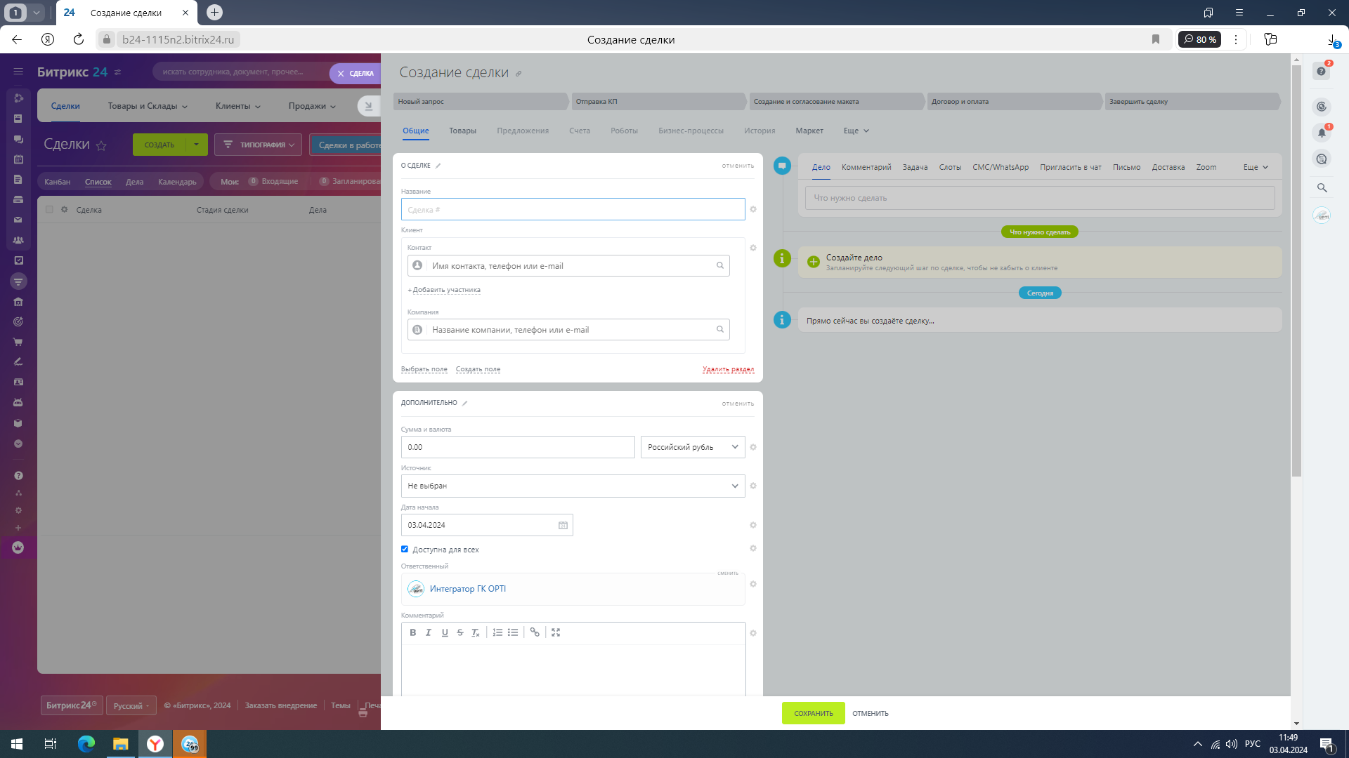 На стадии «Отправка КП» ставится задача на ответственного сотрудника «Подготовить и отправить КП» после того, как задача будет завершена происходит смена стадии на «Создание и согласование макета».