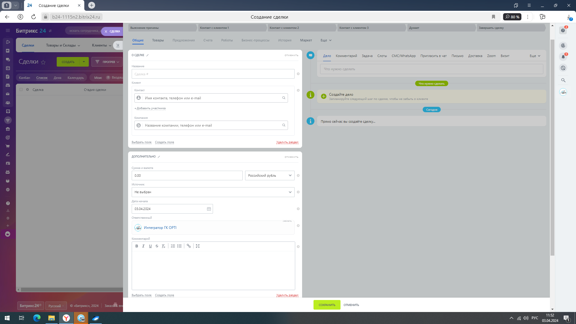 На стадии «Контакт с клиентом 1» ставится задача на ответственного сотрудника «Связаться с клиентом», чтобы совершить первую попытку дозвона. После того, как задача будет завершена, происходит смена стадии на «Контакт с клиентом 2».
