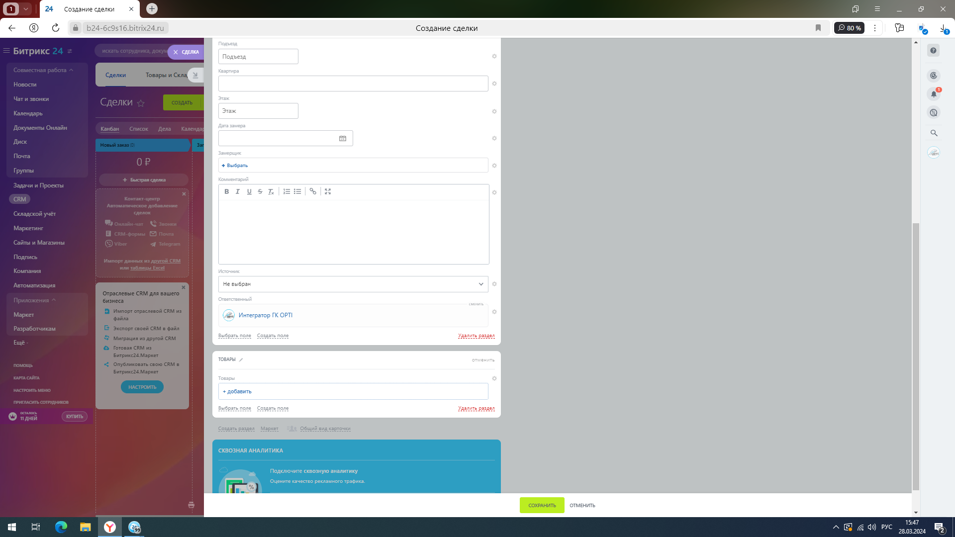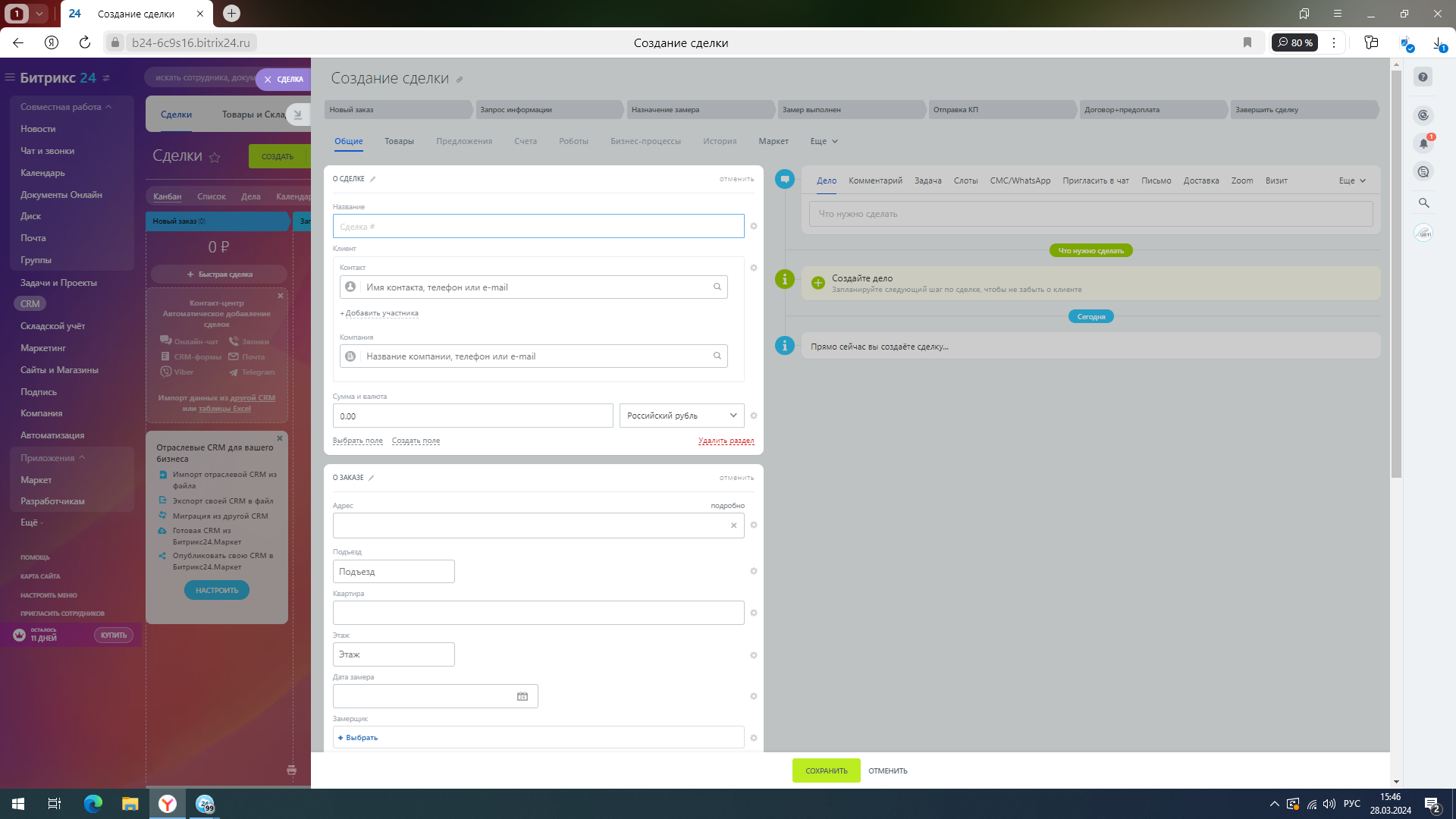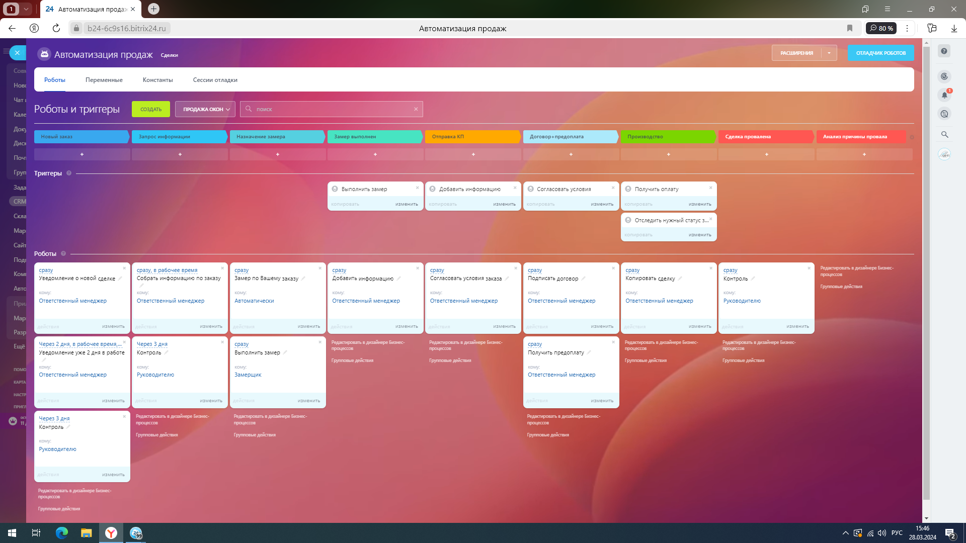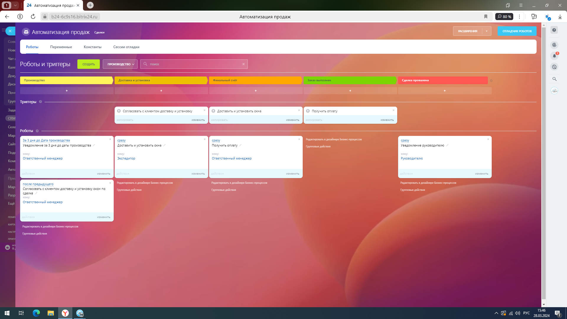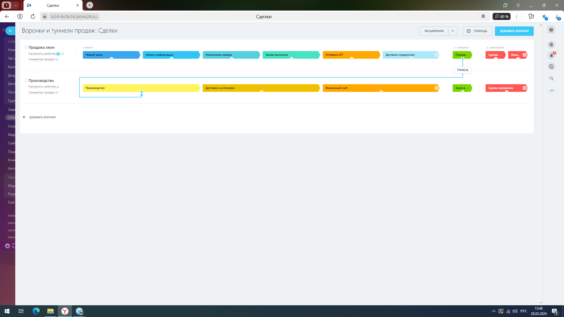 CRM для вашего бизнеса полностью настроена. При настройках учли все этапы Сделки. Созданы воронки сделок: · Продажа окон · Производство