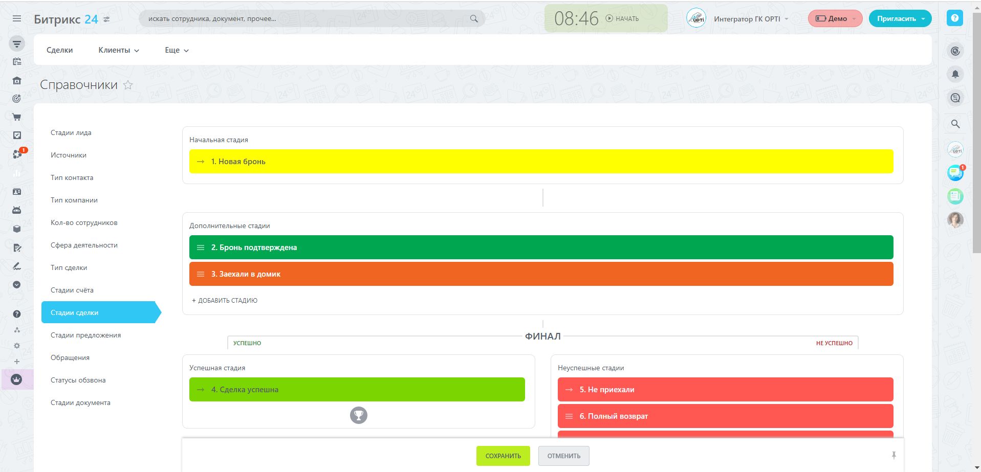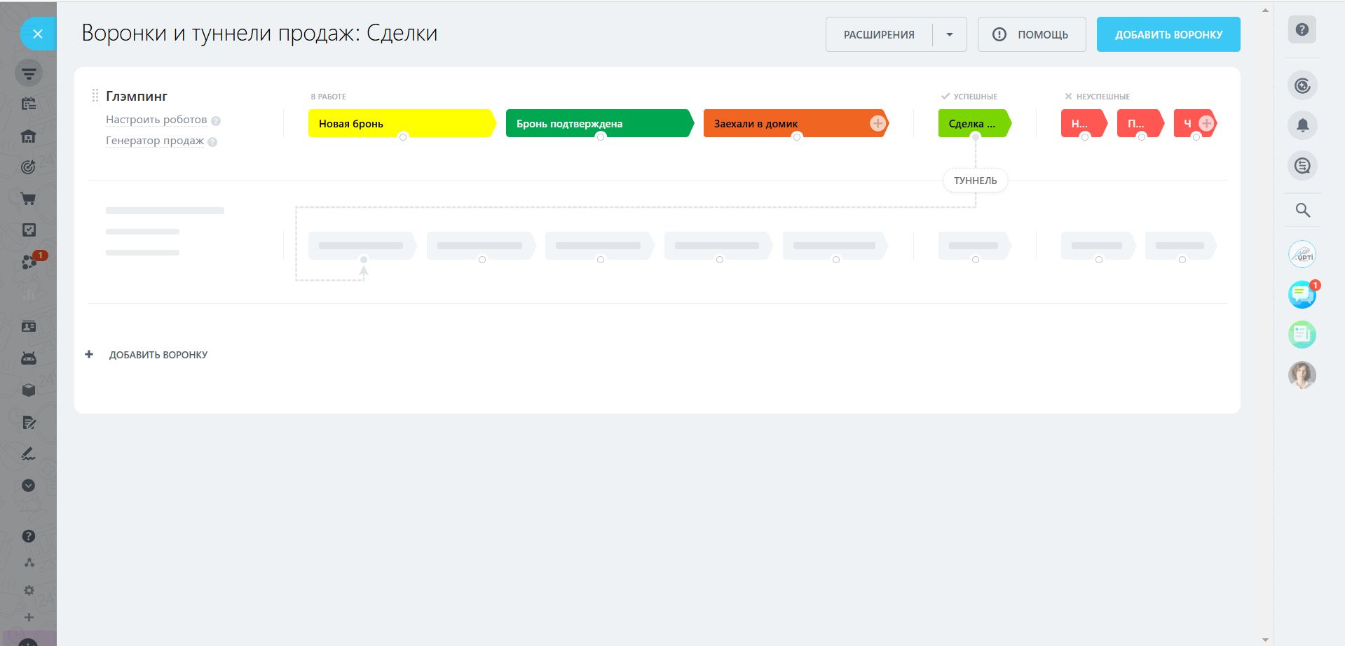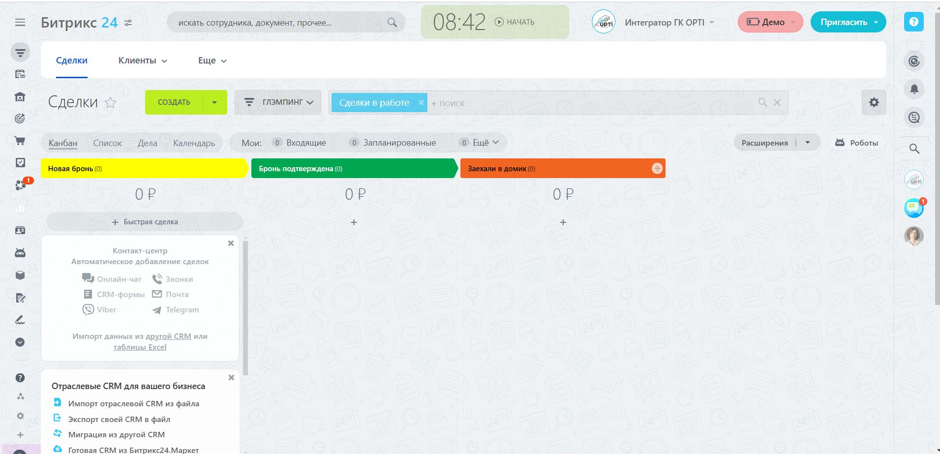 В CRM для глэмпинга настроены стадии сделок, карточки сделок и контактов для того, чтобы вам было проще разобраться в системе.