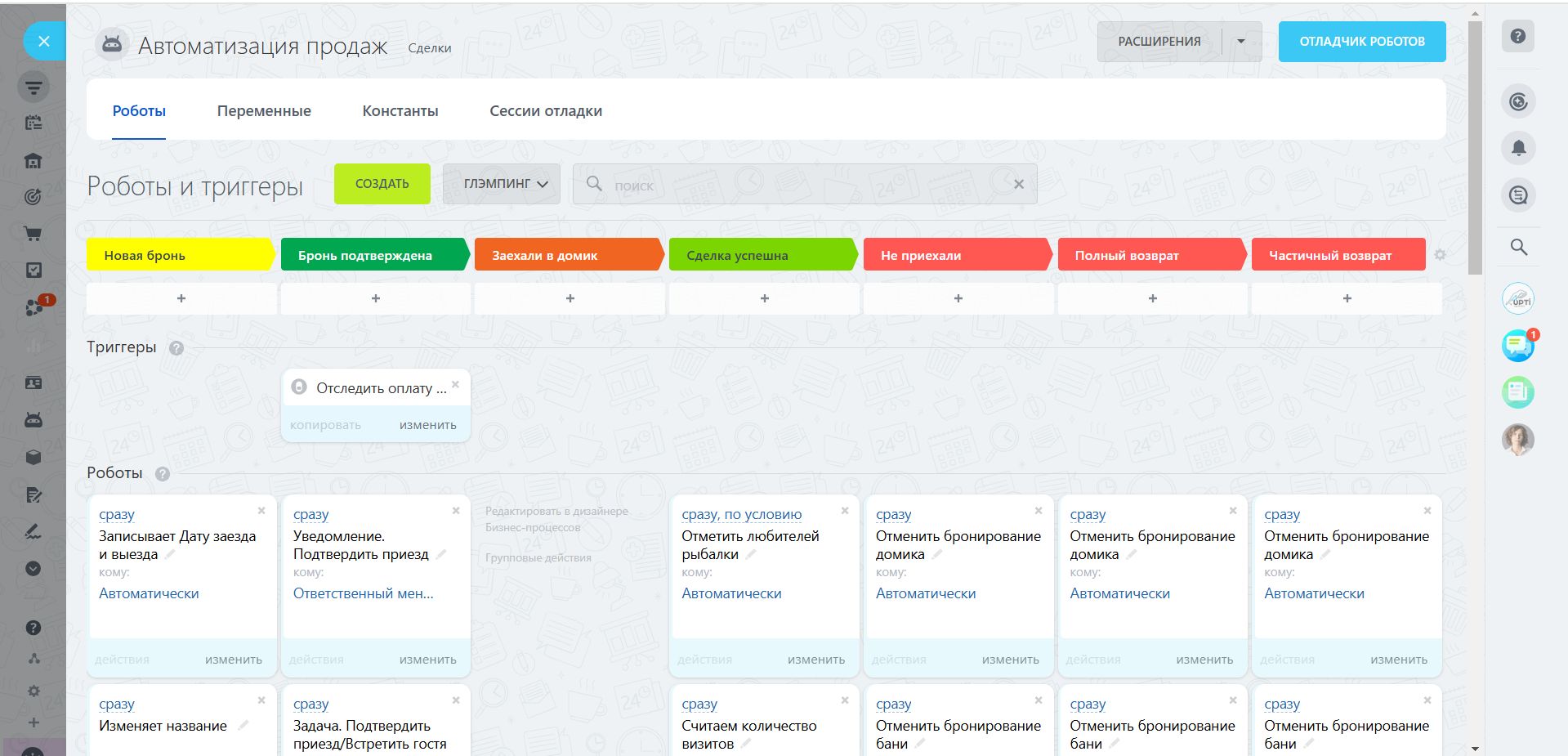 В CRM для глэмпинга на каждой стадии настроены роботы.