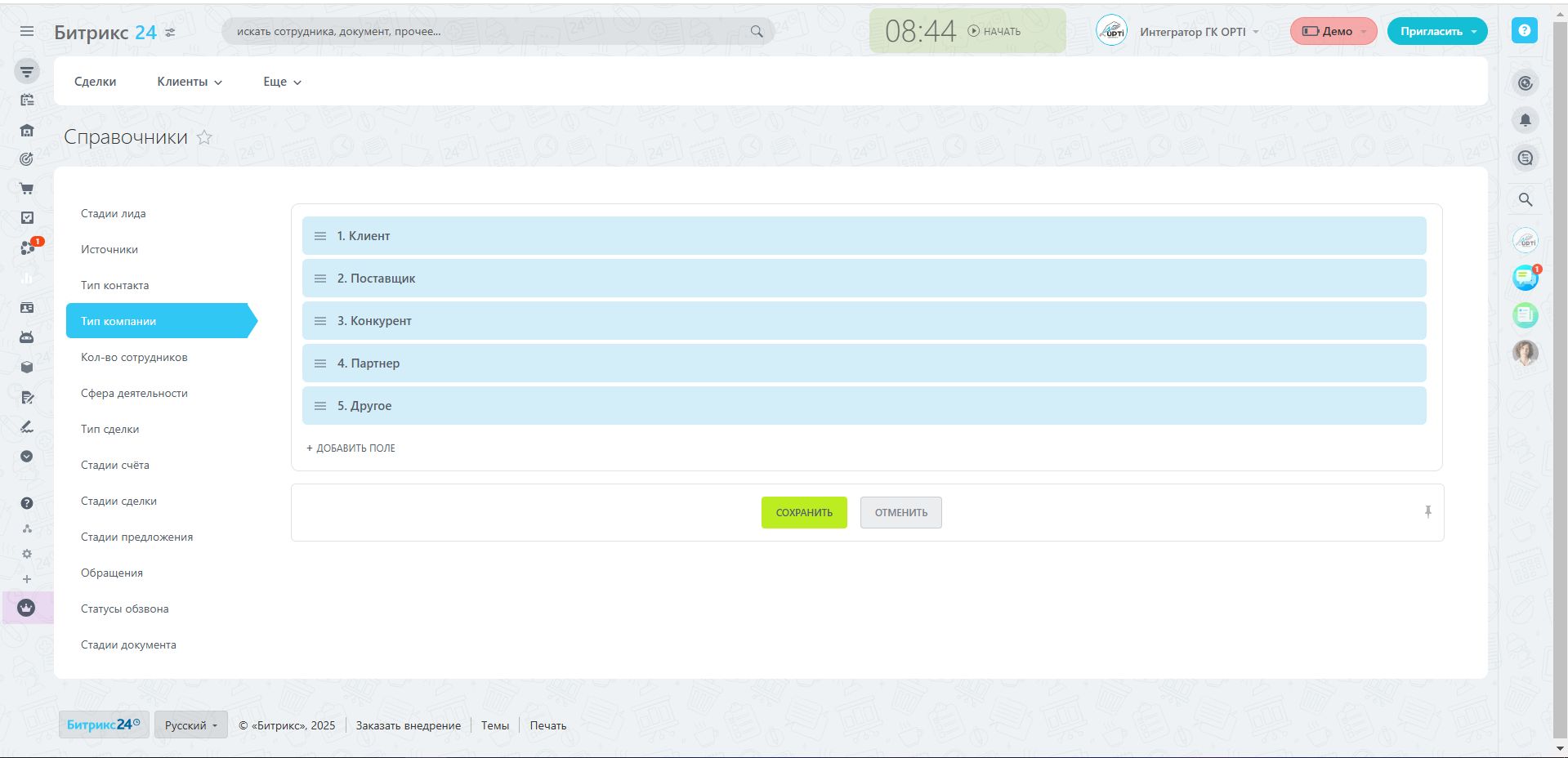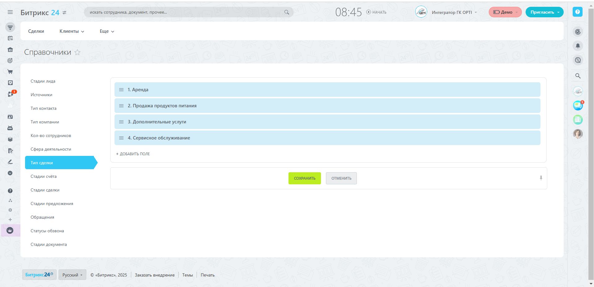 Добавили в справочник: Источники, Сферы деятельности, Типы сделки, Типы событий.