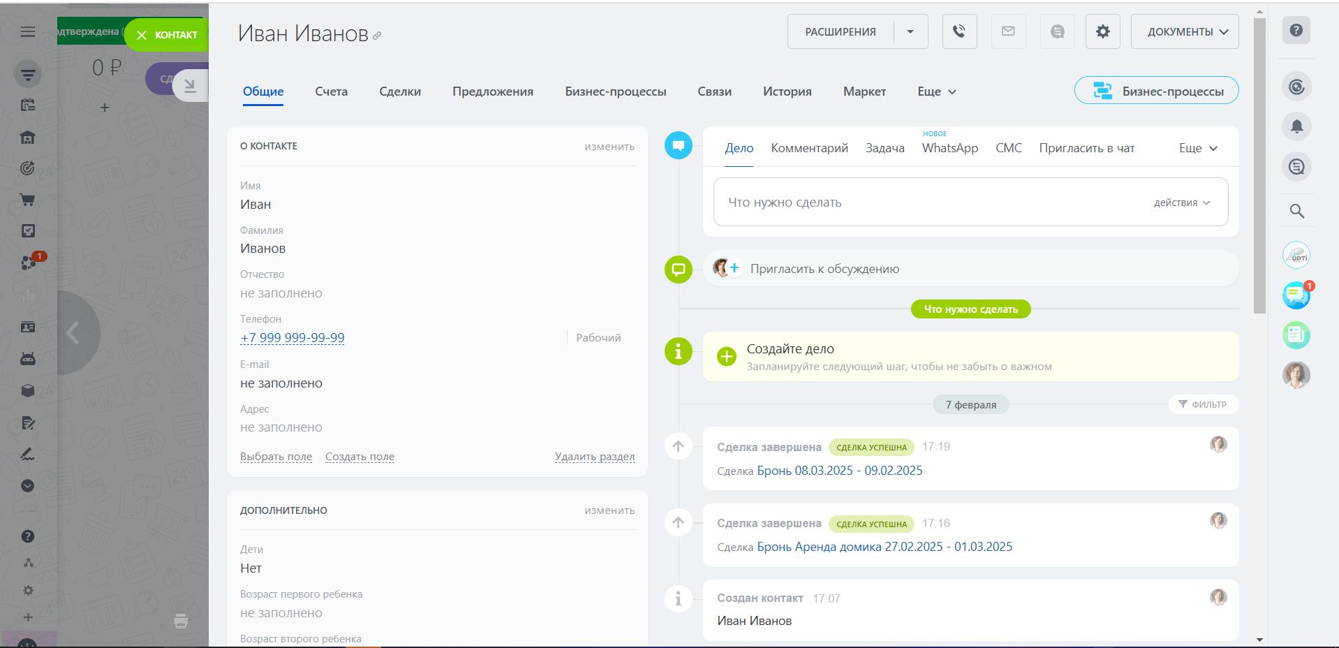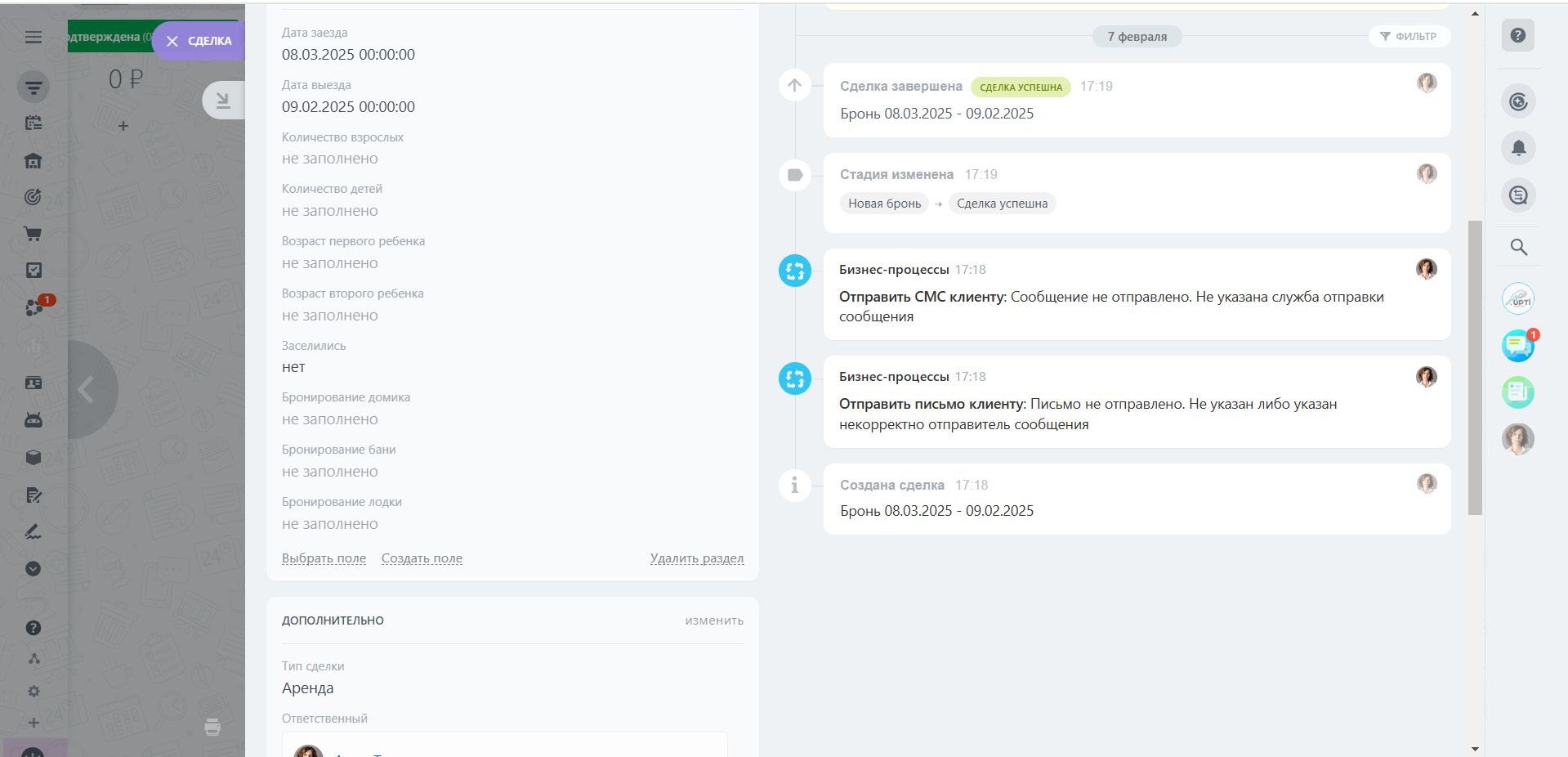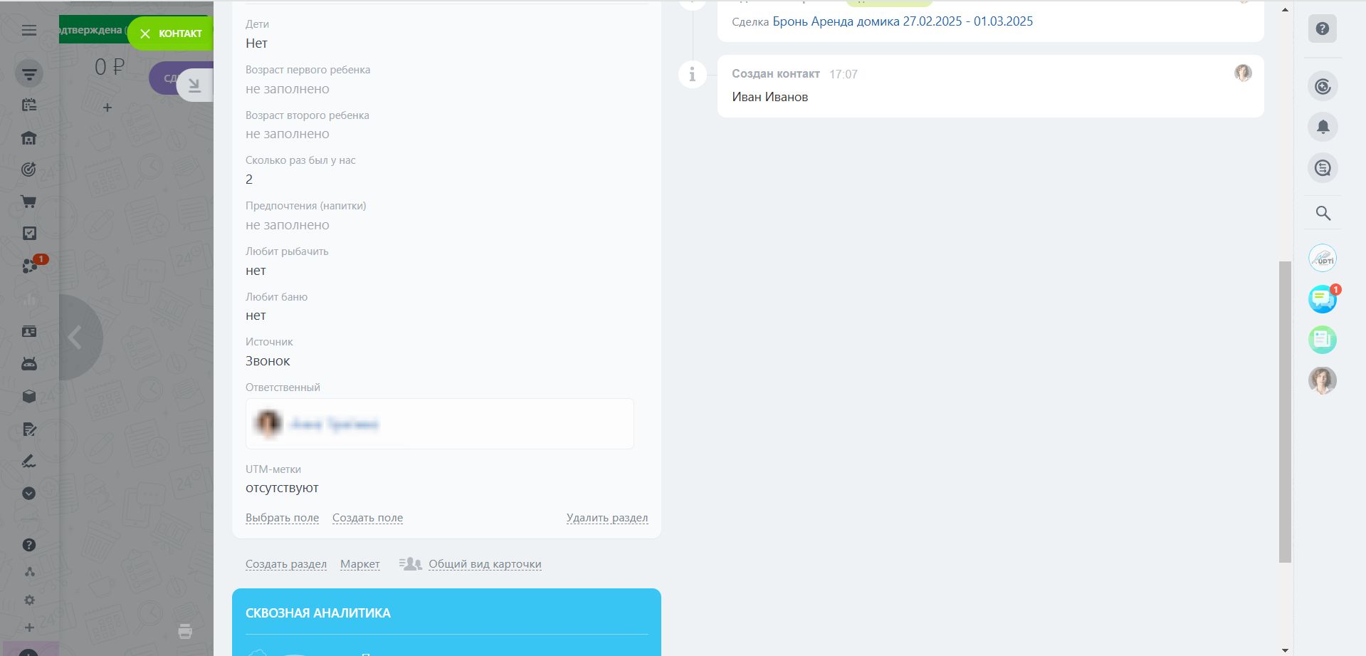 Добавили новые поля в карточку сделки: Количество взрослых, Количество детей, Возраст первого ребенка, Возраст второго ребенка, Бронирование домика, Бронирование бани, Бронирование лодки, Дата заселения, Дата выезда.